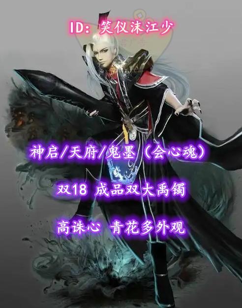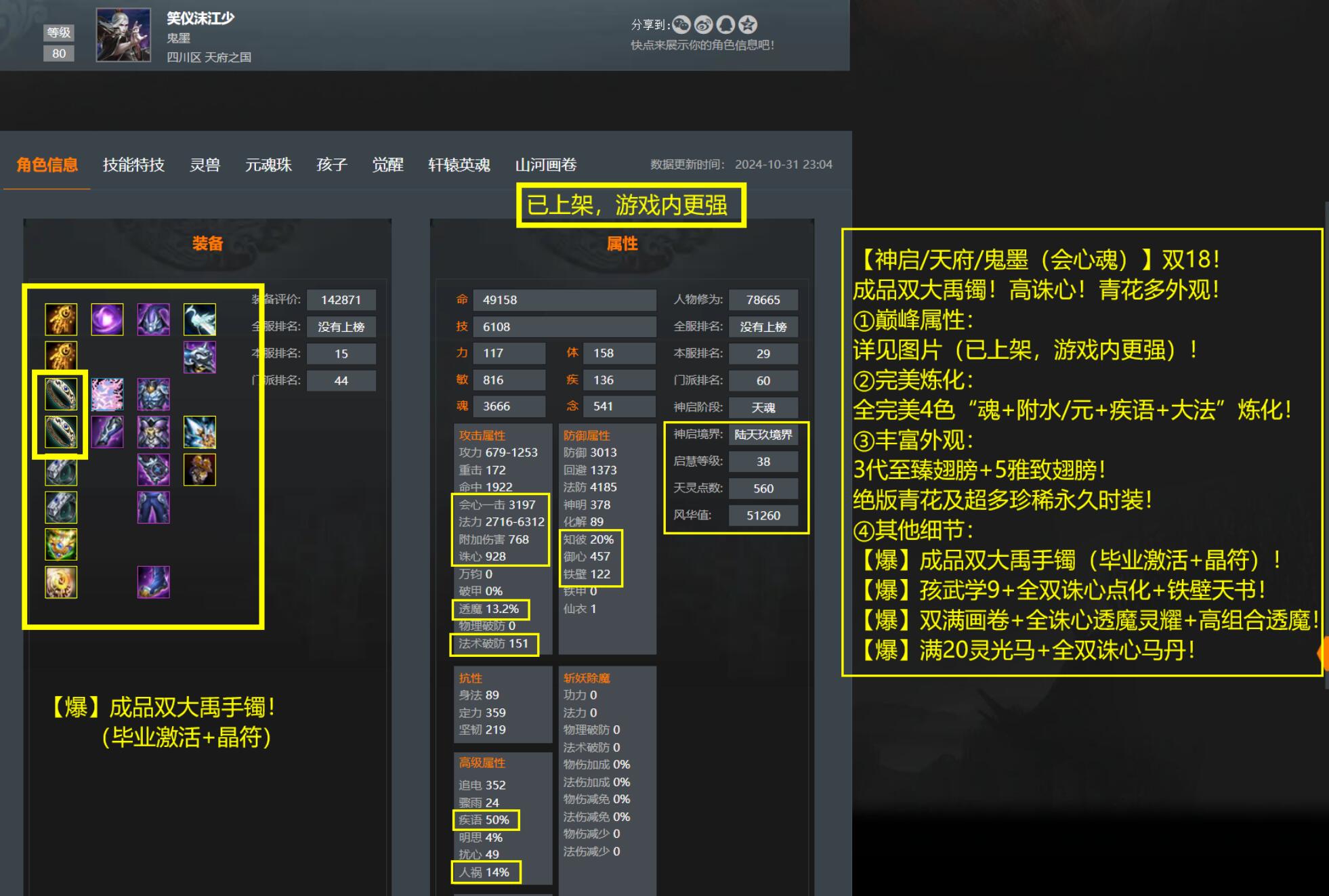 亮点: ①巅峰属性:详见图片(已上架,游戏内更强)! ②完美炼化:全完美4色“魂+附水/元+疾语+大法”炼化! ③丰富外观:3代至臻翅膀+5雅致翅膀!绝版青花及超多珍稀永久时装! ④其他细节:【爆】成品双大禹手镯(毕业激活+晶符)!【爆】孩武学9+全双诛心点化+铁壁天书!【爆】双满画卷+全诛心透魔灵耀+高组合透魔!【爆】满20灵光马+全双诛心马丹!