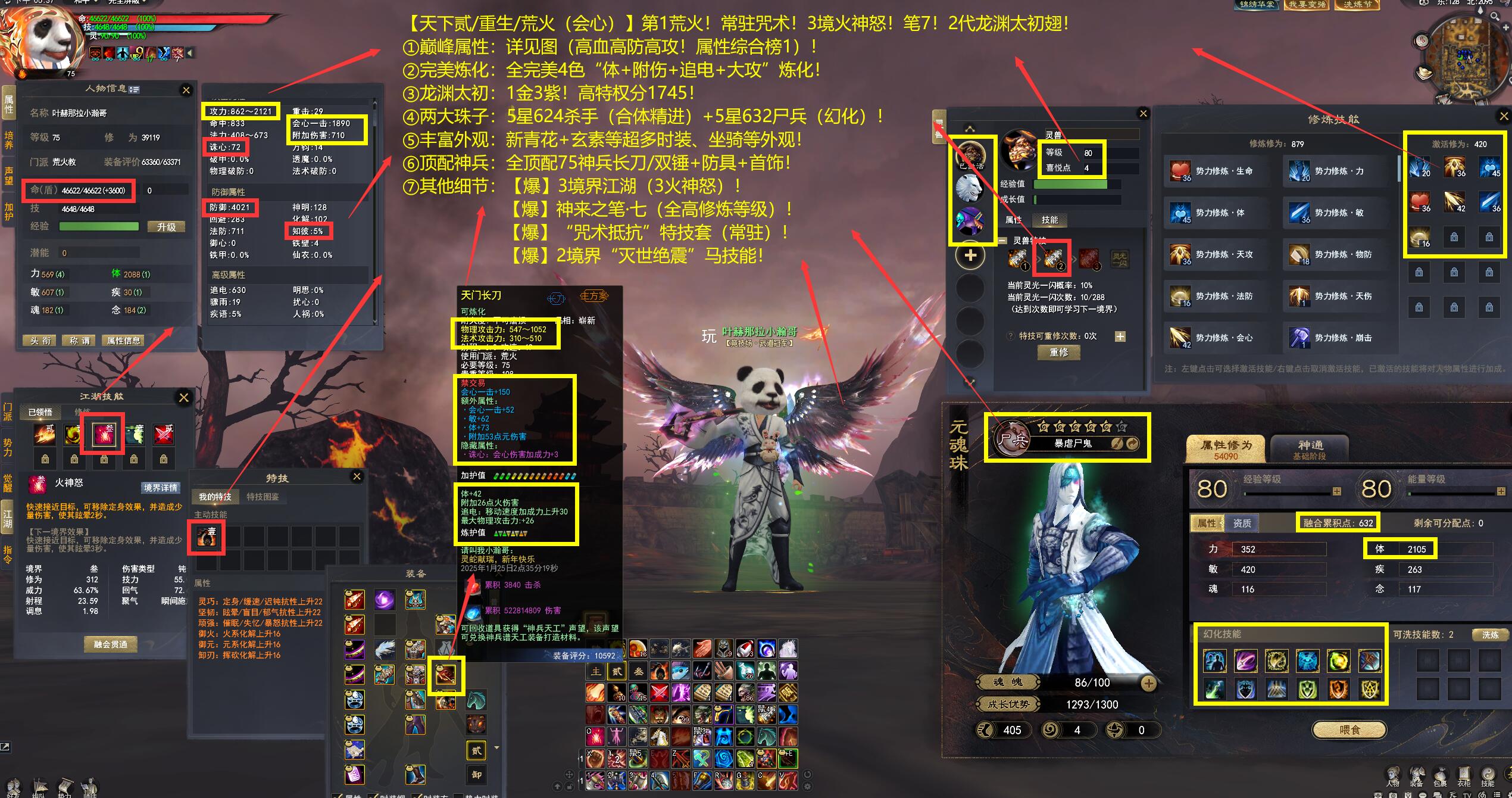 亮点: ①巅峰属性:详见图(高血高防高攻!属性综合榜1)! ②完美炼化:全完美4色“体+附伤+追电+大攻”炼化! ③龙渊太初:1金3紫!高特权分1745! ④两大珠子:5星624杀手(合体精进)+5星632尸兵(幻化)! ⑤丰富外观:新青花+玄素等超多时装、坐骑等外观! ⑥顶配神兵:全顶配75神兵长刀/双锤+防具+首饰! ⑦其他细节:【爆】3境界江湖(3火神怒)!【爆】神来之笔·七(全高修炼等级)!【爆】“咒术抵抗”特技套(常驻)!【爆】2境界“灭世绝震”马技能!