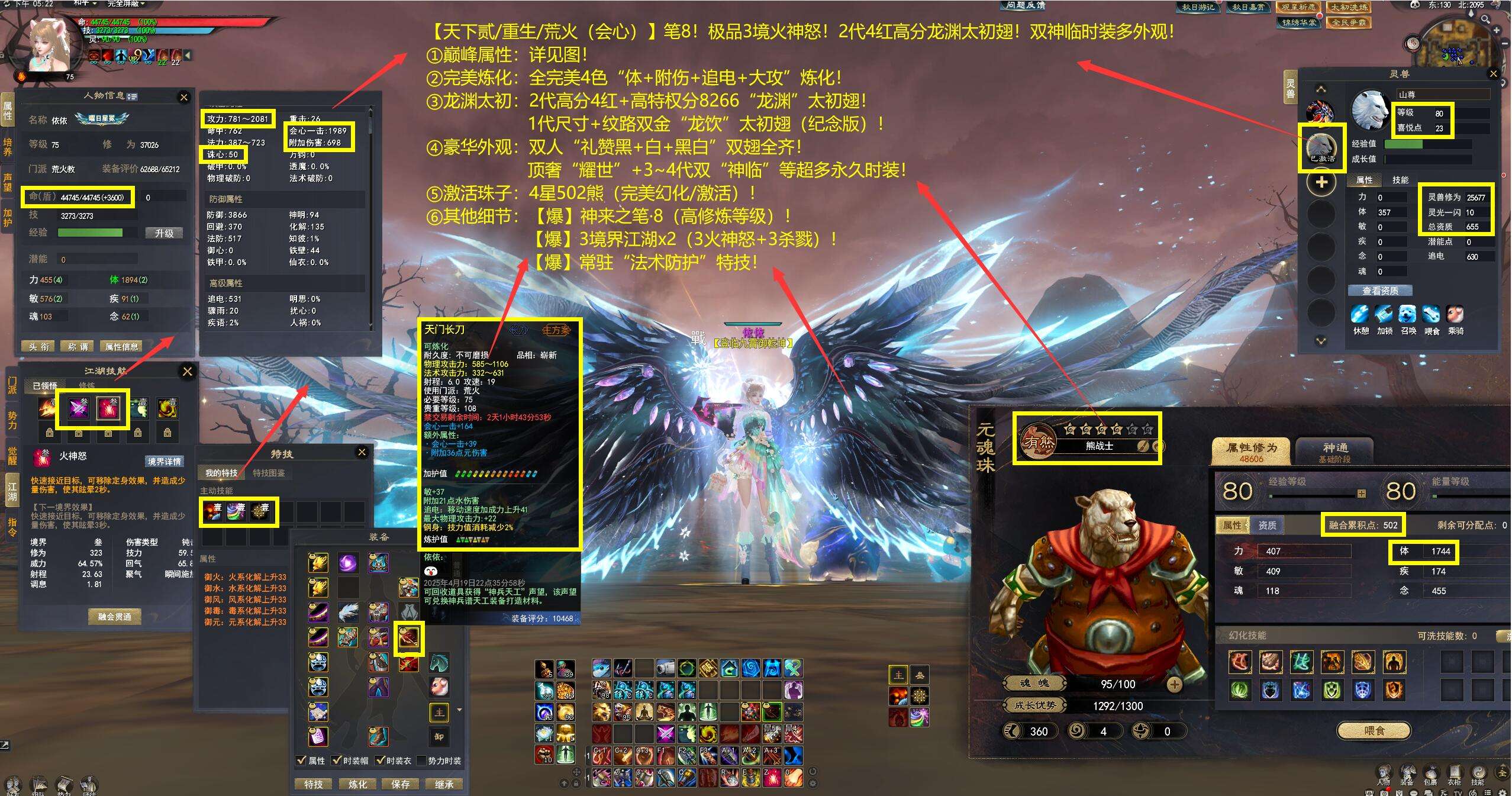 亮点: ①巅峰属性:详见图! ②完美炼化:全完美4色“体+附伤+追电+大攻”炼化! ③龙渊太初:2代高分4红+高特权分8266“龙渊”太初翅!1代尺寸+纹路双金“龙饮”太初翅(纪念版)! ④豪华外观:双人“礼赞黑+白+黑白”双翅全齐!顶奢“耀世”+3~4代双“神临”等超多永久时装! ⑤激活珠子:4星502熊(完美幻化/激活)! ⑥其他细节:【爆】神来之笔·8(高修炼等级)!【爆】3境界江湖x2(3火神怒+3杀戮)!【爆】常驻“法术防护”特技!