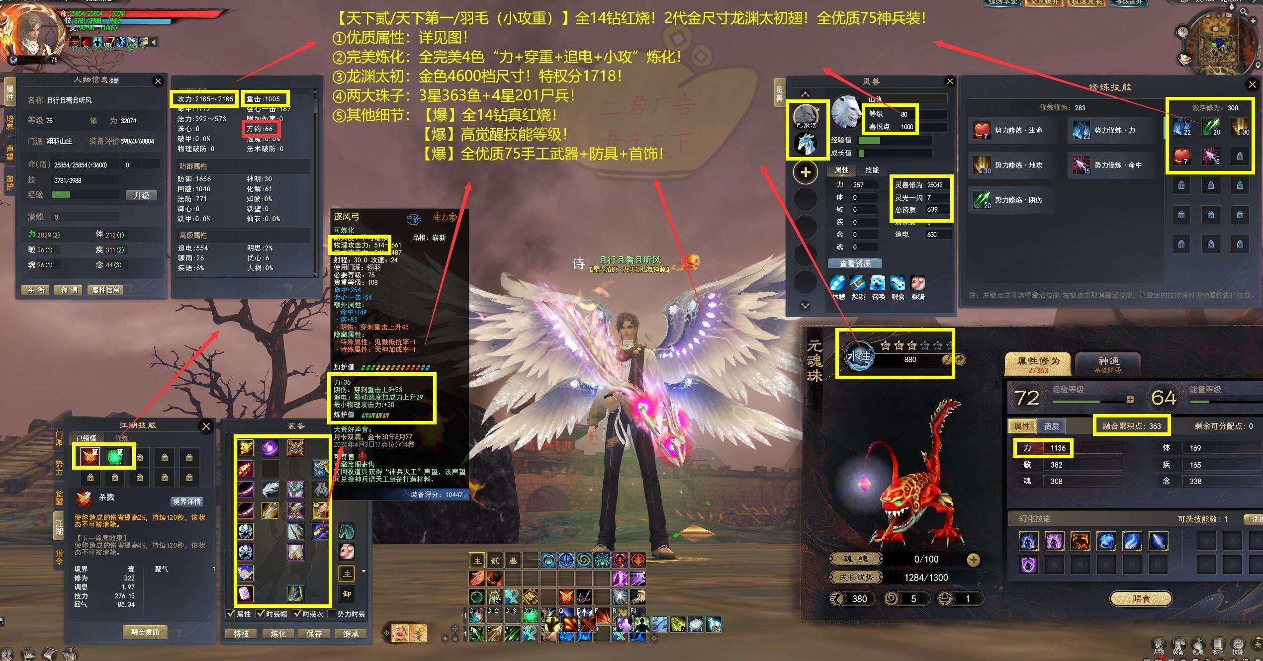 亮点: ①巅峰属性:详见图! ②完美炼化:全完美4色“力+穿重+追电+小攻”炼化! ③龙渊太初:金色4600档尺寸!特权分1718! ④两大珠子:3星363鱼+4星201尸兵! ⑤其他细节:【爆】全14钻真红烧!【爆】高觉醒技能等级!【爆】全优质75手工武器+防具+首饰!