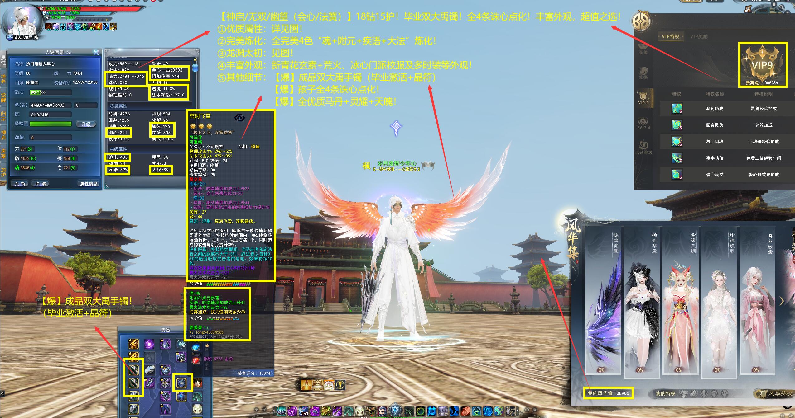 亮点: ①优质属性:详见图! ②完美炼化:全完美4色“魂+附元+疾语+大法”炼化! ③龙渊太初:见图! ④丰富外观:新青花玄素+荒火、冰心门派校服及多时装等外观! ⑤其他细节:【爆】成品双大禹手镯(毕业激活+晶符)【爆】孩子全4条诛心点化!【爆】全优质马丹+灵耀+天魄!