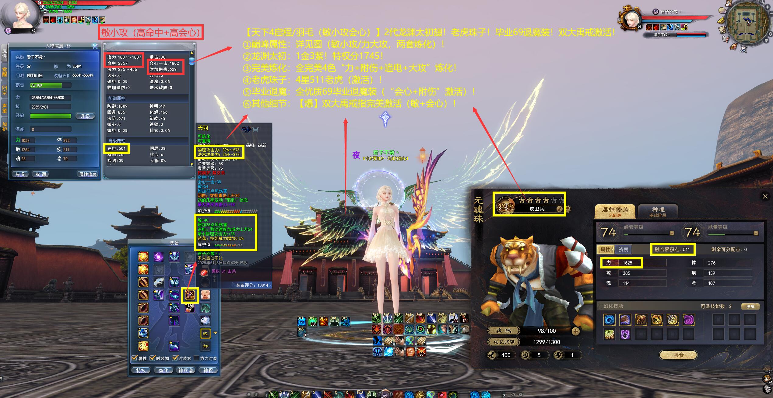 亮点: ①巅峰属性:详见图(敏小攻/力大攻,两套炼化)! ②龙渊太初:1金3紫!特权分1745! ③完美炼化:全完美4色“力+附伤+追电+大攻”炼化! ④老虎珠子:4星511老虎(激活)! ⑤毕业退魔:全优质69毕业退魔装(“会心+附伤”激活)! ⑥其他细节:【爆】双大禹戒指完美激活(敏+会心)!