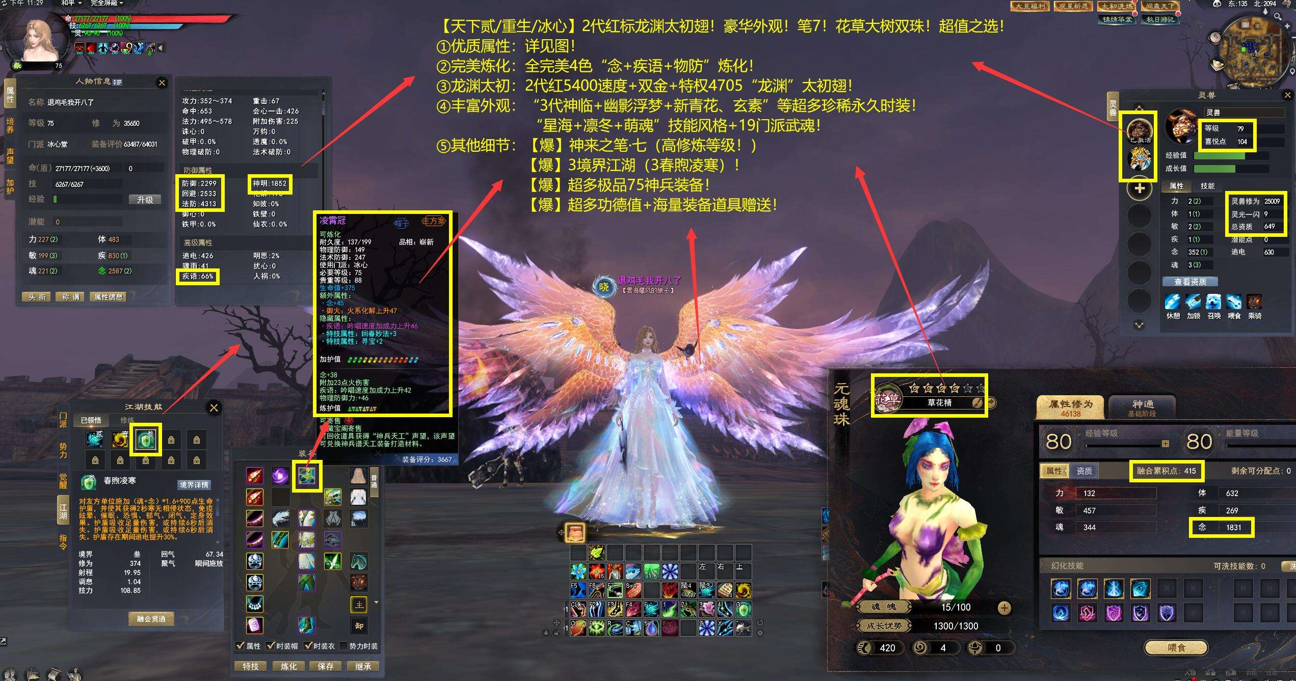亮点: ①优质属性:详见图! ②完美炼化:全完美4色“念+疾语+物防”炼化! ③龙渊太初:2代红5400速度+双金+特权4705“龙渊”太初翅! ④丰富外观:“3代神临+幽影浮梦+新青花、玄素”等超多珍稀永久时装!“星海+凛冬+萌魂”技能风格+19门派武魂! ⑤其他细节:【爆】神来之笔·七(高修炼等级!)【爆】3境界江湖(3春煦凌寒)!【爆】超多极品75神兵装备!【爆】超多功德值+海量装备道具赠送!