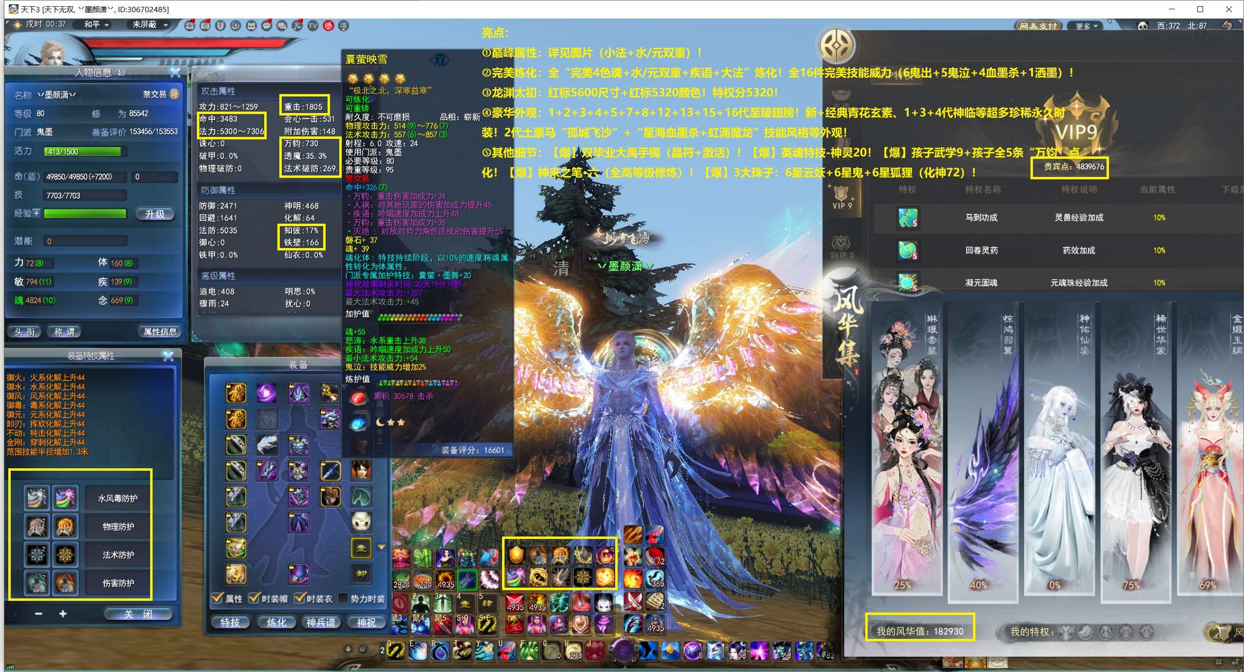 亮点: ①巅峰属性:详见图片(小法+水/元双重)! ②完美炼化:全“完美4色魂+水/元双重+疾语+大法”炼化!全16件完美技能威力(6鬼出+5鬼泣+4血墨杀+1洒墨)! ③龙渊太初:红标5600尺寸+红标5320颜色!特权分5320! ④豪华外观:1+2+3+4+5+7+8+12+13+15+16代至臻翅膀!新+经典青花玄素、1+3+4代神临等超多珍稀永久时装!2代土豪马“孤城飞沙”+“星海血墨杀+虹涌魔龙”技能风格等外观!