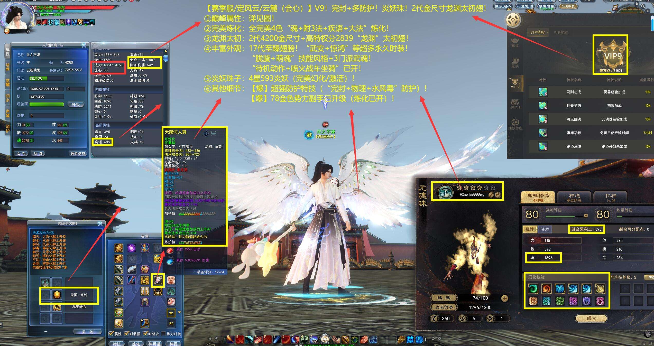 亮点: ①巅峰属性:详见图! ②完美炼化:全完美4色“魂+附3法+疾语+大法”炼化! ③龙渊太初:2代4200金尺寸+高特权分2839“龙渊”太初翅! ④丰富外观:17代至臻翅膀!“武安+惊鸿”等超多永久时装!“胧漩+萌魂”技能风格+3门派武魂!最新“待机动作+喷火战车坐骑”已开! ⑤炎妖珠子:4星593炎妖(完美幻化/激活)! ⑥其他细节:【爆】超强防护特技(“完封+物理+水风毒”防护)!【爆】78金色势力副手已升级(炼化已开)!