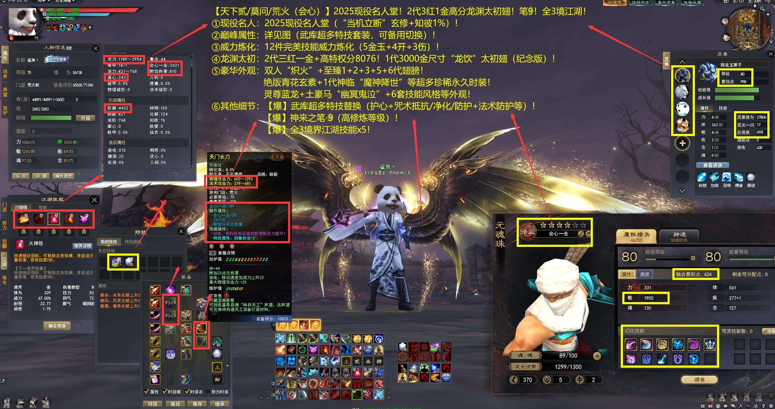 亮点: ①现役名人:2025现役名人堂(“当机立断”玄修+知彼1%)! ②巅峰属性:详见图(武库超多特技套装,可备用切换)! ③威力炼化:12件完美技能威力炼化(5金玉+4开+3伤)! ④龙渊太初:2代三红一金+高特权分8076!1代3000金尺寸“龙饮”太初翅(纪念版)! ⑤豪华外观:双人“炽火”+至臻1+2+3+5+6代翅膀!绝版青花玄素+1代神临“魔神降世”等超多珍稀永久时装!灵尊蓝龙+土豪马“幽冥鬼泣”+6套技能风格等外观!
