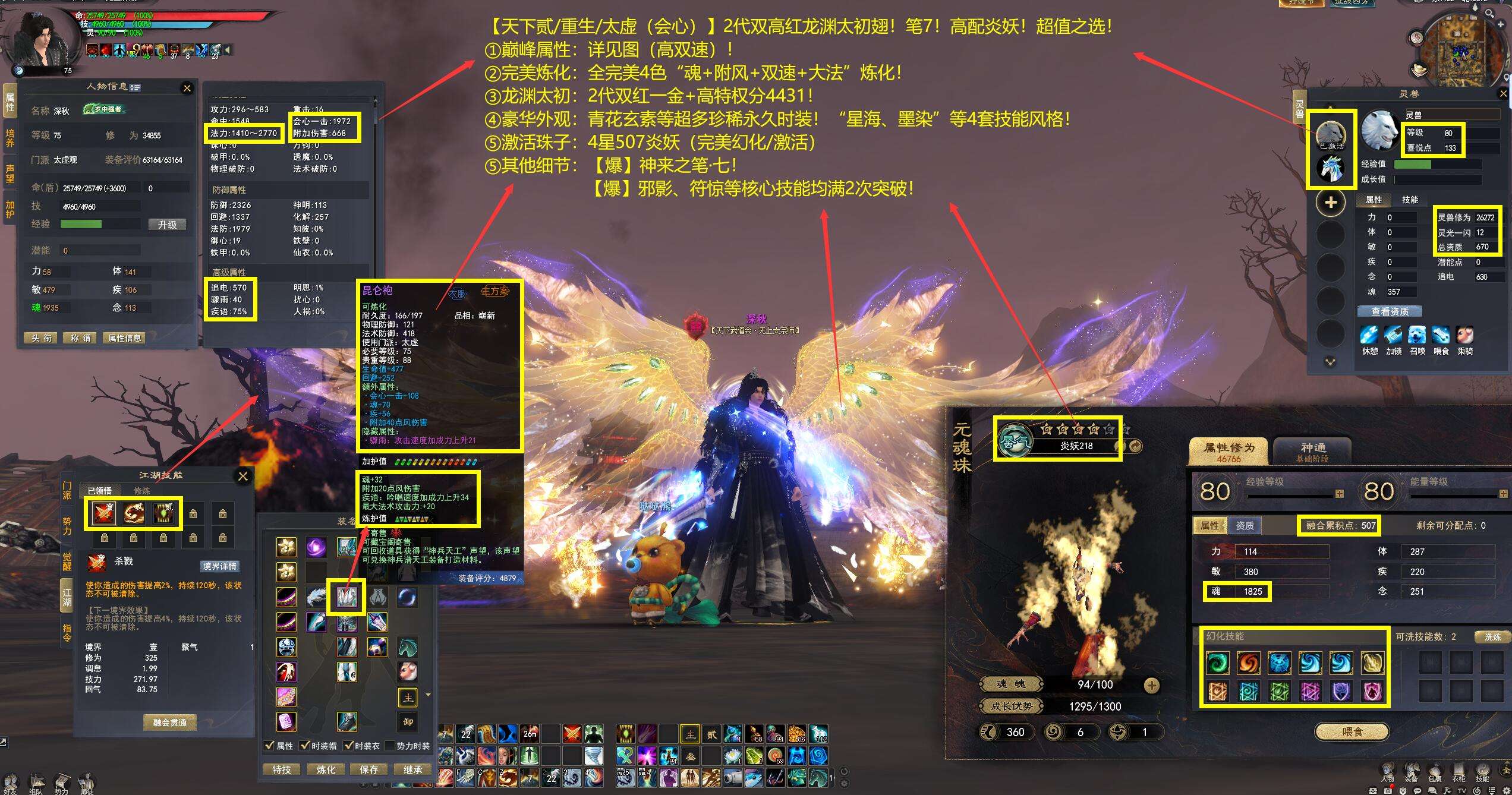 亮点: ①巅峰属性:详见图(高双速)! ②完美炼化:全完美4色“魂+附风+双速+大法”炼化! ③龙渊太初:2代双红一金+高特权分4431! ④豪华外观:青花玄素等超多珍稀永久时装!“星海、墨染”等4套技能风格! ⑤激活珠子:4星507炎妖(完美幻化/激活) ⑤其他细节:【爆】神来之笔·七!【爆】邪影、符惊等核心技能均满2次突破!