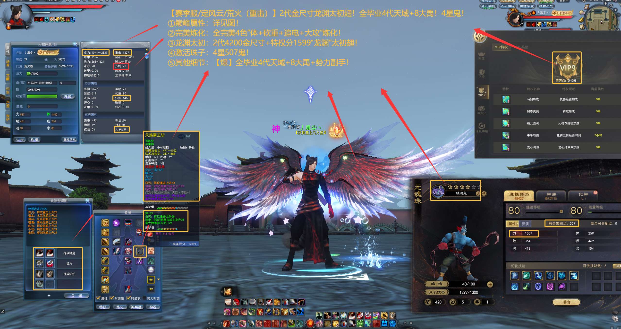 亮点: ①巅峰属性:详见图! ②完美炼化:全完美4色“体+砍重+追电+大攻”炼化! ③龙渊太初:2代4200金尺寸+特权分1599“龙渊”太初翅! ④激活珠子:4星507鬼! ⑤其他细节:【爆】全毕业4代天域+8大禹+势力副手!