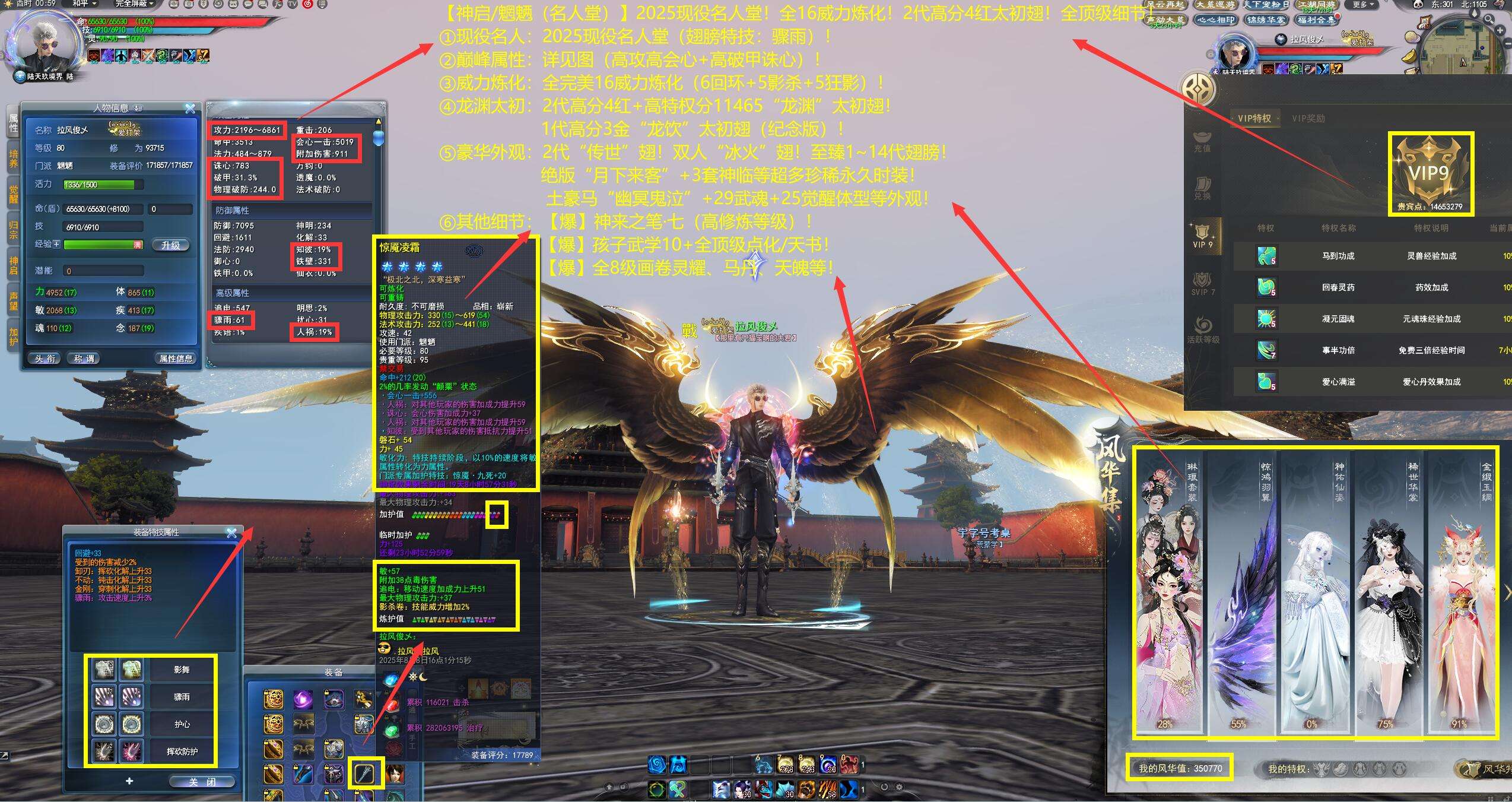 亮点: ①现役名人:2025现役名人堂(翅膀特技:骤雨)! ②巅峰属性:详见图(高攻高会心+高破甲诛心)! ③威力炼化:全完美16威力炼化(6回环+5影杀+5狂影)! ④龙渊太初:2代高分4红+高特权分11465“龙渊”太初翅!1代高分3金“龙饮”太初翅(纪念版)! ⑤豪华外观:2代“传世”翅!双人“冰火”翅!至臻1~14代翅膀!绝版“月下来客”+3套神临等超多珍稀永久时装!土豪马“幽冥鬼泣”+29武魂+25觉醒体型等外观!