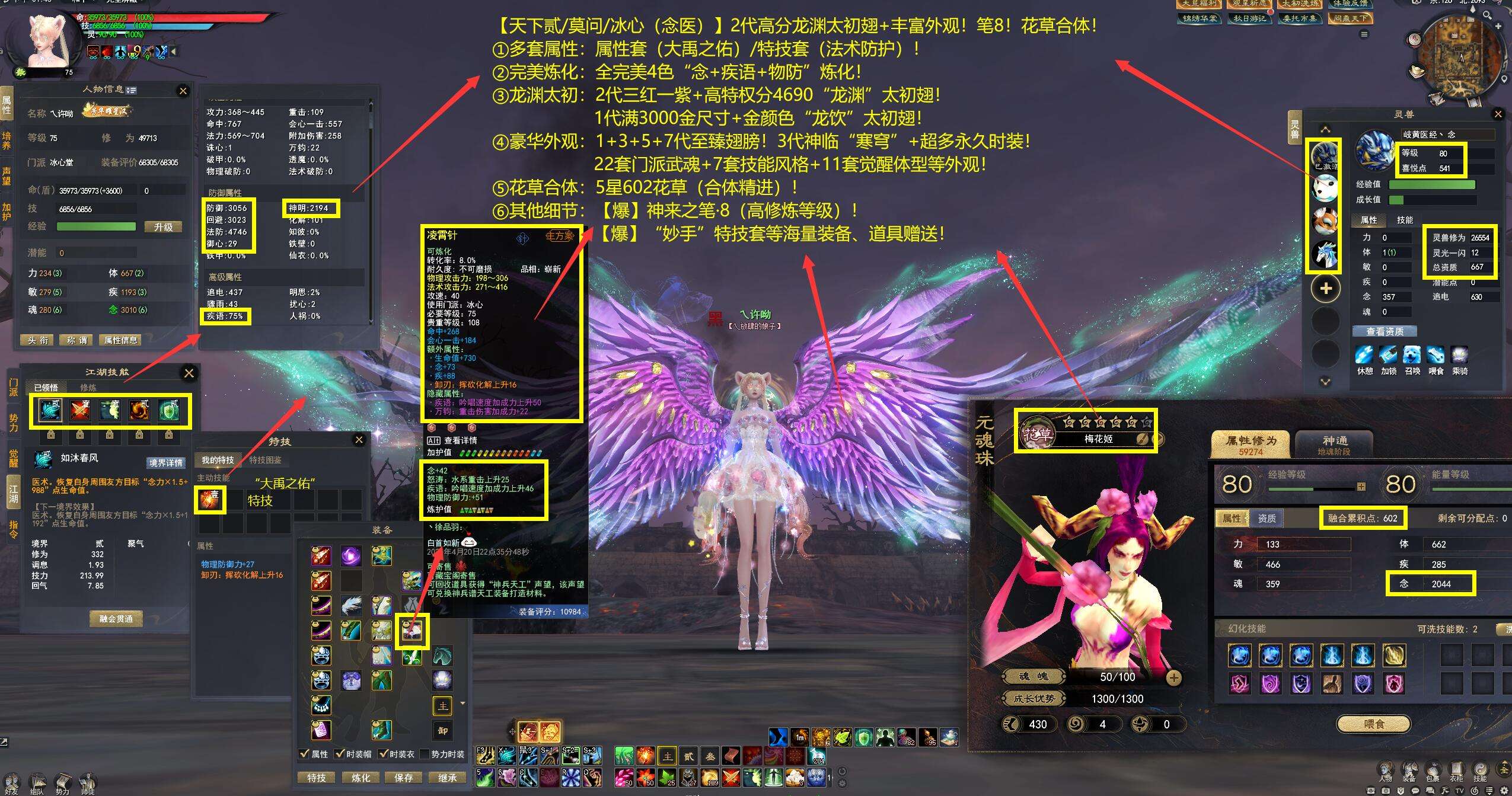 亮点: ①多套属性:属性套(大禹之佑)/特技套(法术防护)! ②完美炼化:全完美4色“念+疾语+物防”炼化! ③龙渊太初:2代三红一紫+高特权分4690“龙渊”太初翅!1代满3000金尺寸+金颜色“龙饮”太初翅! ④豪华外观:1+3+5+7代至臻翅膀!3代神临“寒穹”+超多永久时装!22套门派武魂+7套技能风格+11套觉醒体型等外观! ⑤花草合体:5星602花草(合体精进)! ⑥其他细节:【爆】神来之笔·8(高修炼等级)!【爆】“妙手”特技套等海量装备、道具赠送!