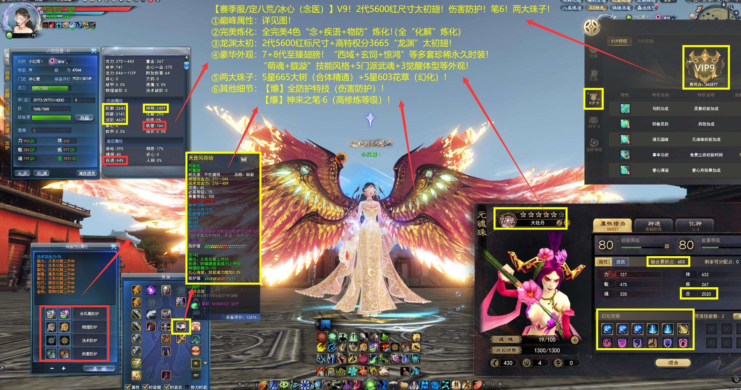亮点: ①巅峰属性:详见图! ②完美炼化:全完美4色“念+疾语+物防”炼化(全“化解”炼化)! ③龙渊太初:2代5600红标尺寸+高特权分3665“龙渊”太初翅! ④豪华外观:7+8代至臻翅膀!“西域+玄饲+惊鸿”等多套珍稀永久时装!“萌魂+胧漩”技能风格+5门派武魂+3觉醒体型等外观! ⑤两大珠子:5星665大树(合体精通)+5星603花草(幻化)! ⑥其他细节:【爆】全防护特技(伤害防护)!【爆】神来之笔·6(高修炼等级)!