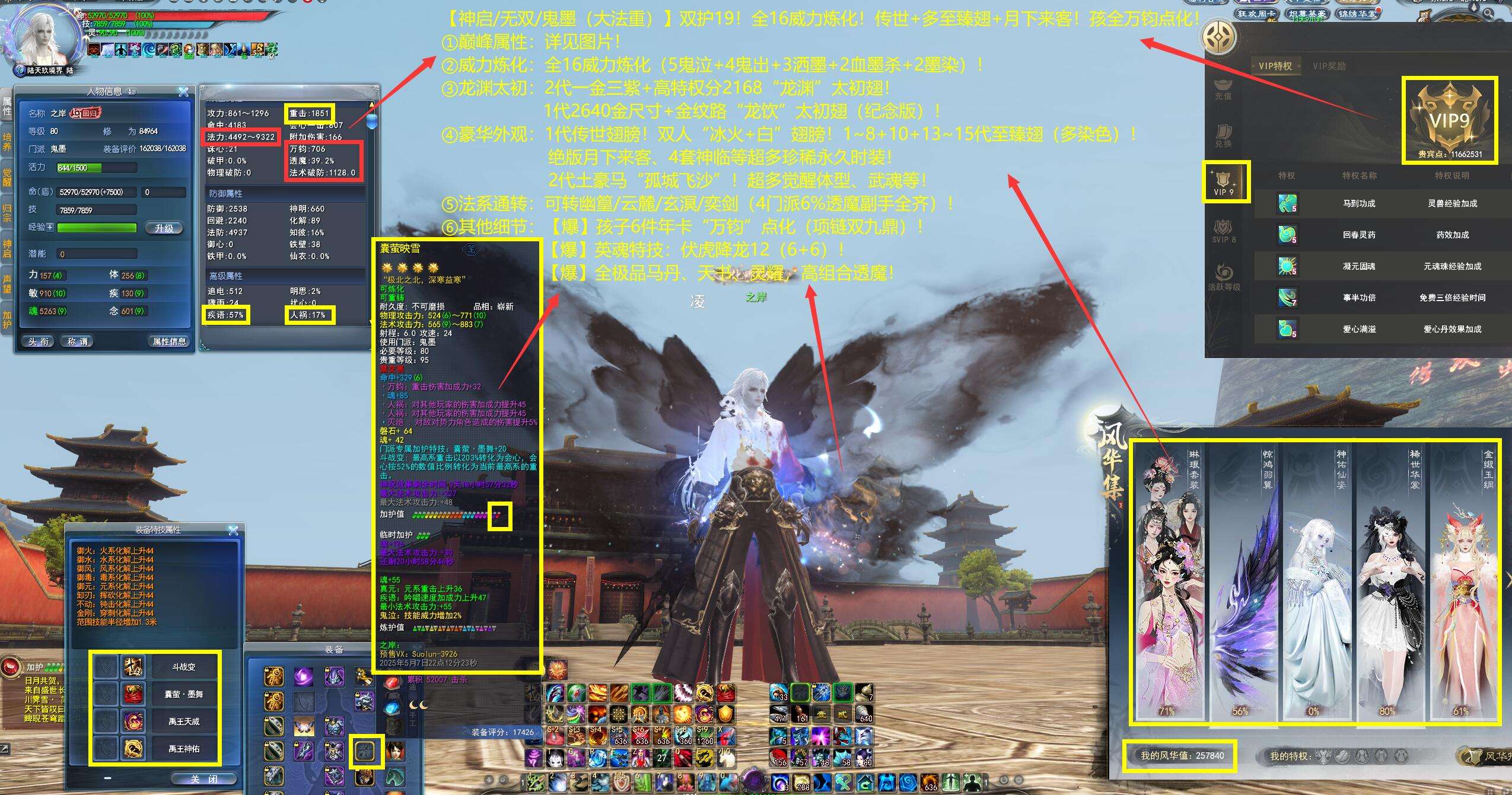 亮点: ①巅峰属性:详见图片! ②威力炼化:全16威力炼化(5鬼泣+4鬼出+3洒墨+2血墨杀+2墨染)! ③龙渊太初:2代一金三紫+高特权分2168“龙渊”太初翅!1代2640金尺寸+金纹路“龙饮”太初翅(纪念版)! ④豪华外观:1代传世翅膀!双人“冰火+白”翅膀!1~8+10+13~15代至臻翅(多染色)!绝版月下来客、4套神临等超多珍稀永久时装!2代土豪马“孤城飞沙”!超多觉醒体型、武魂等! ⑤法系通转:可转幽篁/云麓/玄溟/奕剑(4门派6%透魔副手全齐)!