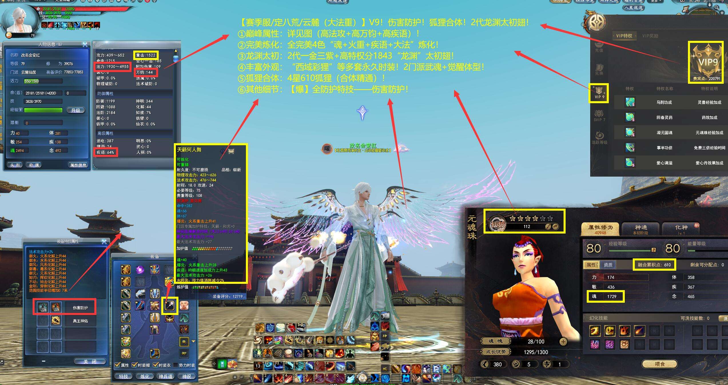 亮点: ①巅峰属性:详见图(高法攻+高万钧+高疾语)! ②完美炼化:全完美4色“魂+火重+疾语+大法”炼化! ③龙渊太初:2代一金三紫+高特权分1843“龙渊”太初翅! ④丰富外观:“西域彩狸”等多套永久时装!2门派武魂+觉醒体型! ⑤狐狸合体:4星610狐狸(合体精通)! ⑥其他细节:【爆】全防护特技——伤害防护!