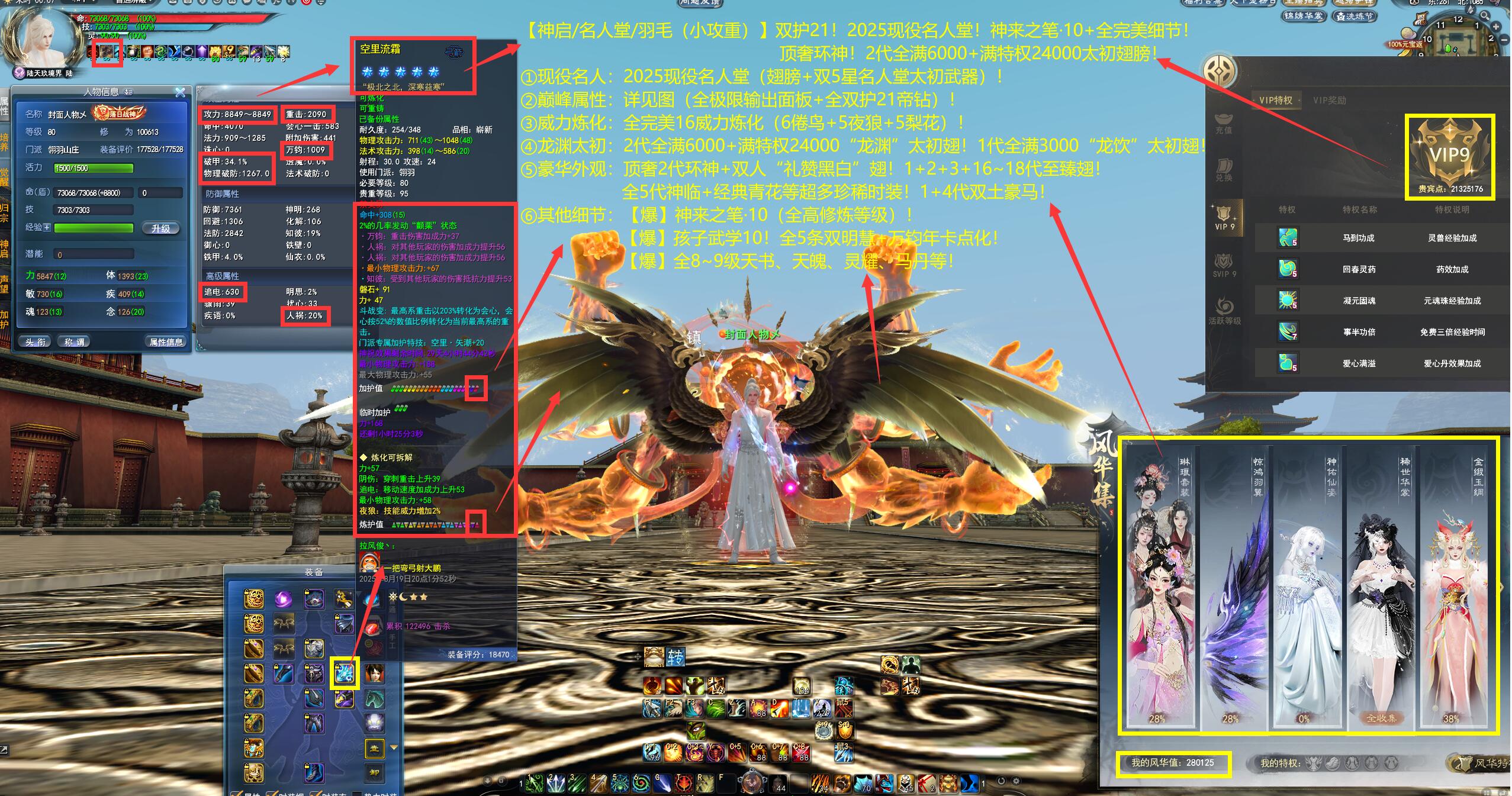 亮点: ①现役名人:2025现役名人堂(翅膀+双5星名人堂太初武器)! ②巅峰属性:详见图(全极限输出面板+全双护21帝钻)! ③威力炼化:全完美16威力炼化(6倦鸟+5夜狼+5梨花)! ④龙渊太初:2代全满6000+满特权24000“龙渊”太初翅!1代全满3000“龙饮”太初翅! ⑤豪华外观:顶奢2代环神+双人“礼赞黑白”翅!1+2+3+16~18代至臻翅!全5代神临+经典青花等超多珍稀时装!1+4代双土豪马!