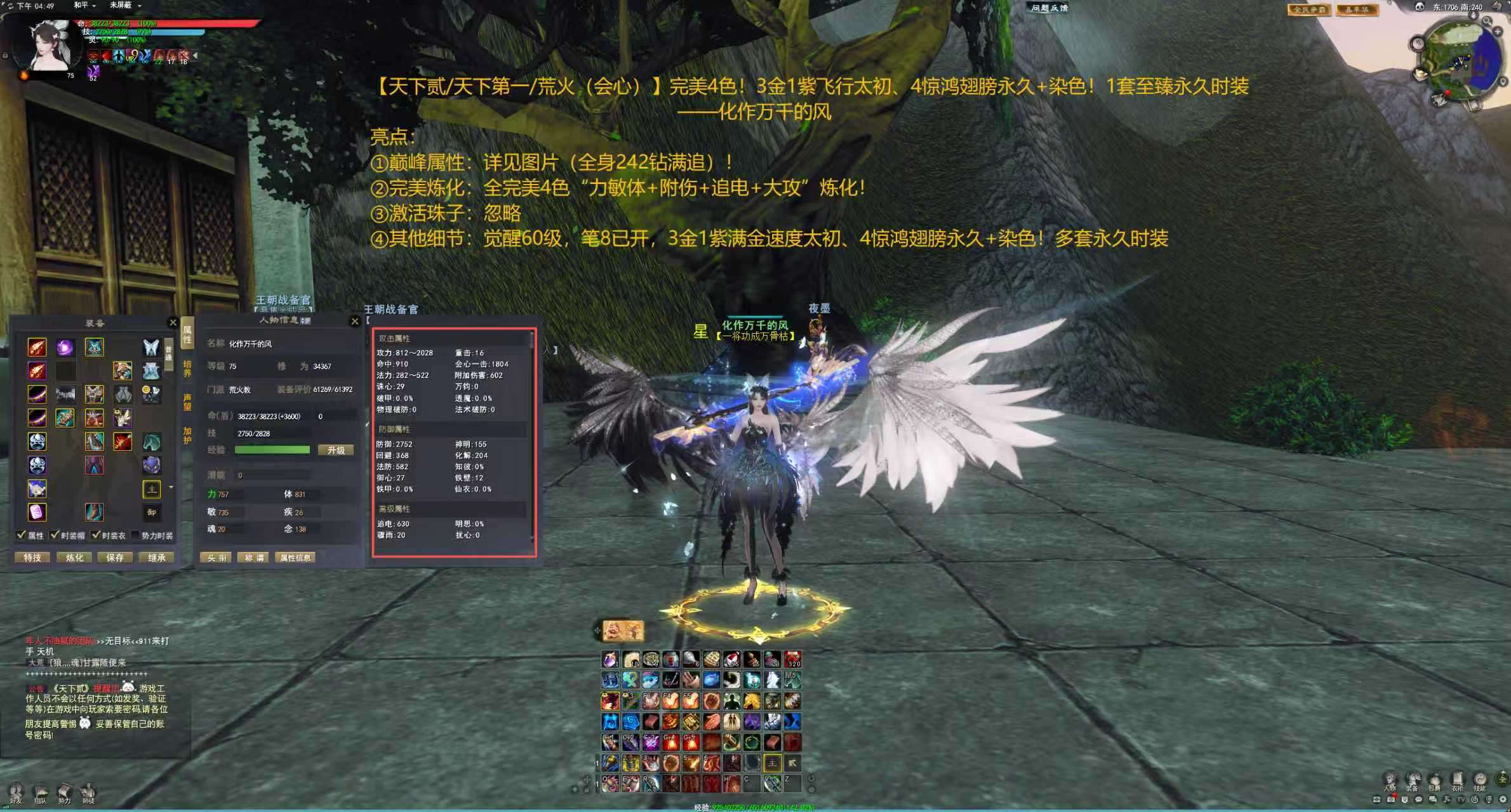 亮点: ①巅峰属性:详见图片(242钻满追)! ②完美炼化:全完美4色“力敏体+附伤+追电+大攻”炼化! ③激活珠子:忽略 ④其他细节:觉醒60级,笔8已开,3金1紫飞行太初、4惊鸿翅膀永久+染色!多套永久时装
