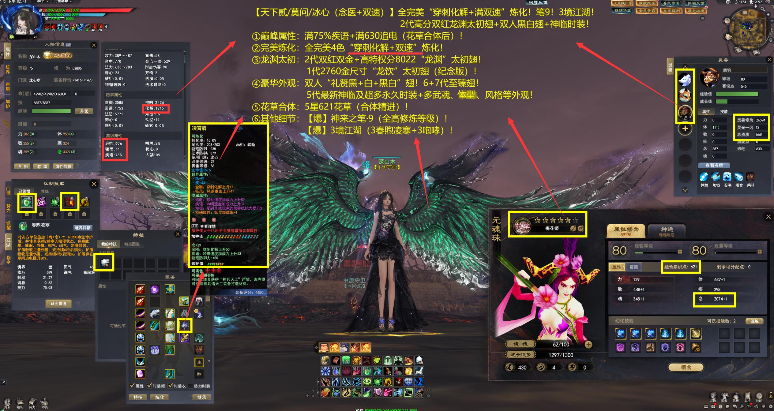 亮点: ①巅峰属性:满75%疾语+满630追电(花草合体后)! ②完美炼化:全完美4色“穿刺化解+双速”炼化! ③龙渊太初:2代双红双金+高特权分8022“龙渊”太初翅!1代2760金尺寸“龙饮”太初翅(纪念版)! ④豪华外观:双人“礼赞黑+白+黑白”翅!6+7代至臻翅!5代最新神临及超多永久时装+多武魂、体型、风格等外观! ⑤花草合体:5星621花草(合体精进)! ⑥其他细节:【爆】神来之笔·9(全高修炼等级)!【爆】3境江湖(3春煦凌寒+3咆哮)!