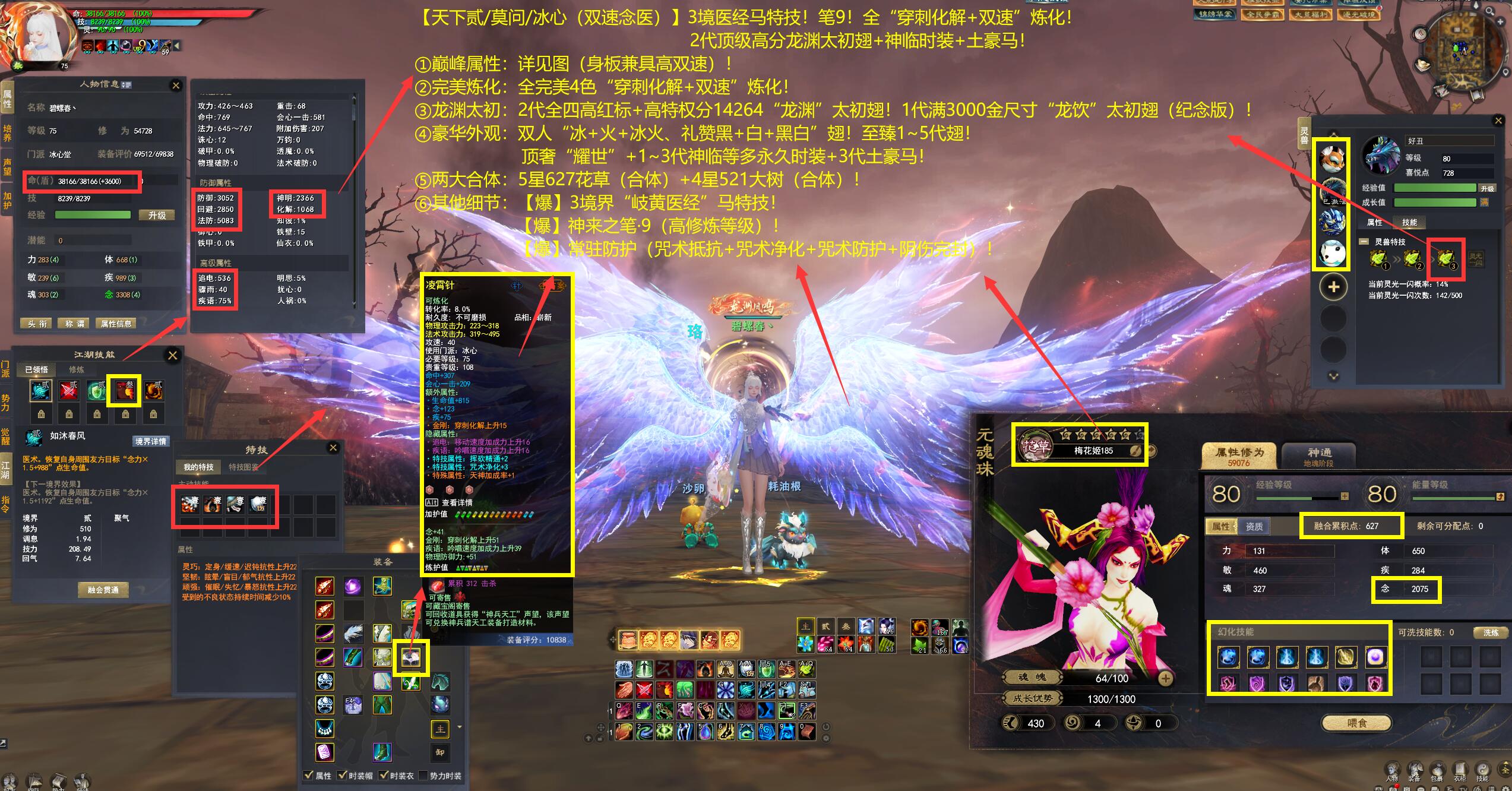 【天下贰/莫问/冰心(双速念医)】3境医经马特技!笔9!全“穿刺化解+双速”炼化!2代顶级高分龙渊太初翅+神临时装+土豪马——碧螺春丶