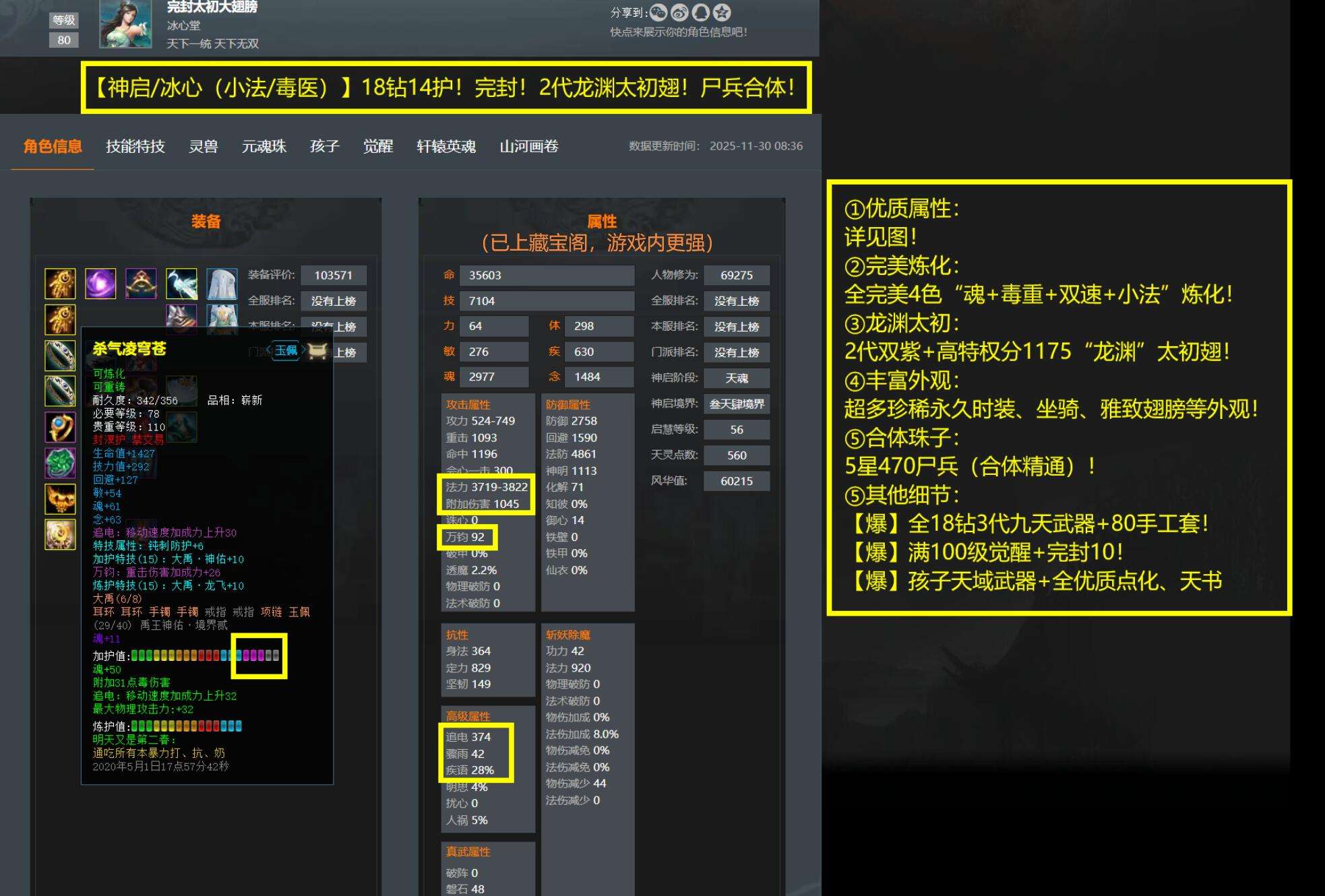 亮点: ①优质属性:详见图! ②完美炼化:全完美4色“魂+毒重+双速+小法”炼化! ③龙渊太初:2代双紫+高特权分1175“龙渊”太初翅! ④丰富外观:超多珍稀永久时装、坐骑、雅致翅膀等外观! ⑤合体珠子:5星470尸兵(合体精通)! ⑤其他细节:【爆】全18钻3代九天武器+80手工套!【爆】满100级觉醒+完封10!【爆】孩子天域武器+全优质点化、天书