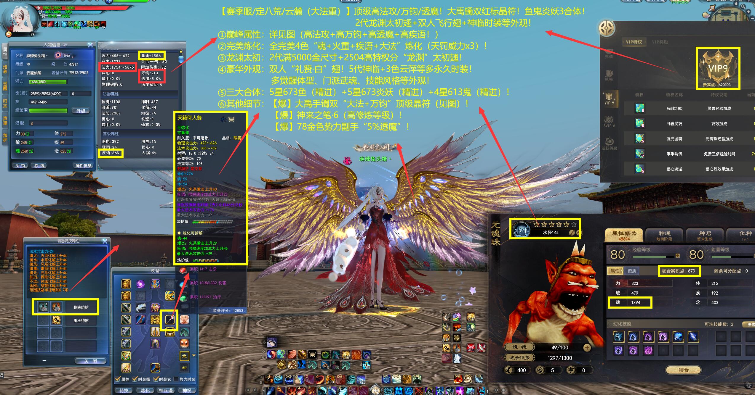 亮点: ①巅峰属性:详见图(高法攻+高万钧+高透魔+高疾语!) ②完美炼化:全完美4色“魂+火重+疾语+大法”炼化(天罚威力x3)! ③龙渊太初:2代满5000金尺寸+2504高特权分“龙渊”太初翅! ④豪华外观:双人“礼赞·白”翅!5代神临+3色云萍等多永久时装!多觉醒体型、门派武魂、技能风格等外观! ⑤三大合体:5星673鱼(精进)+5星673炎妖(精进)+4星613鬼(精进)!
