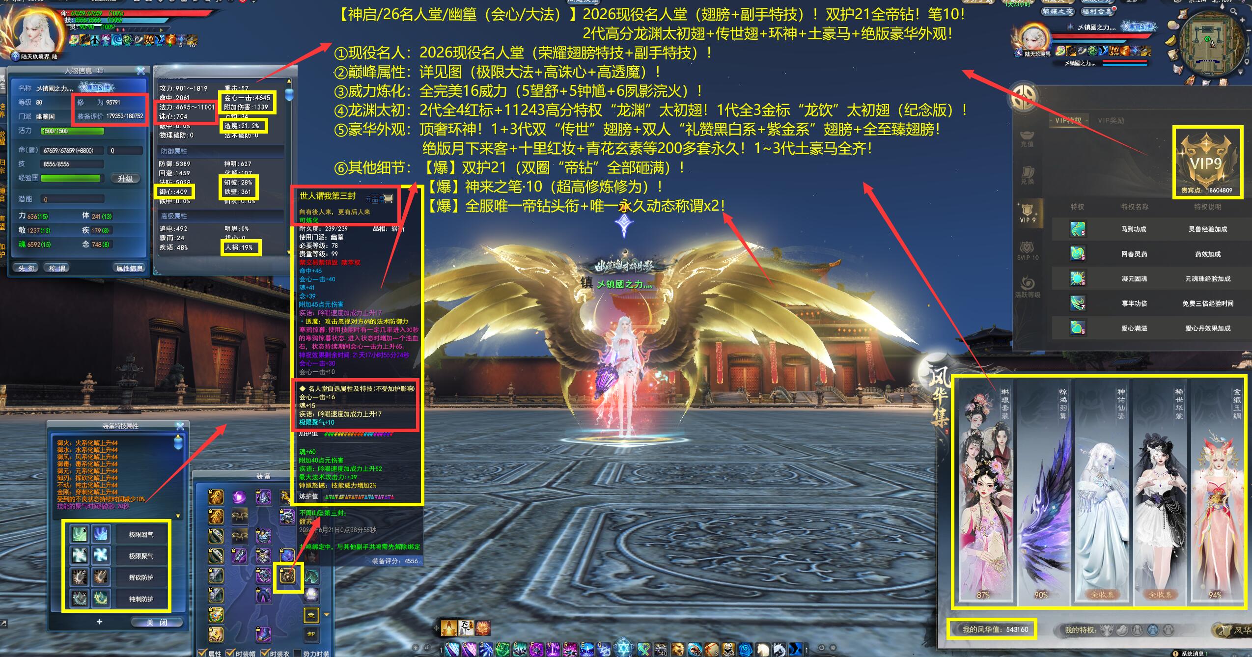 亮点: ①现役名人:2026现役名人堂(荣耀翅膀特技+副手特技)! ②巅峰属性:详见图(极限大法+高诛心+高透魔)! ③威力炼化:全完美16威力(5望舒+5钟馗+6夙影浣火)! ④龙渊太初:2代全4红标+11243高分特权“龙渊”太初翅!1代全3金标“龙饮”太初翅(纪念版)! ⑤豪华外观:顶奢环神!1+3代双“传世”翅膀+双人“礼赞黑白系+紫金系”翅膀+全至臻翅膀!绝版月下来客+十里红妆+青花玄素等200多套永久!1~3代土豪马全齐!