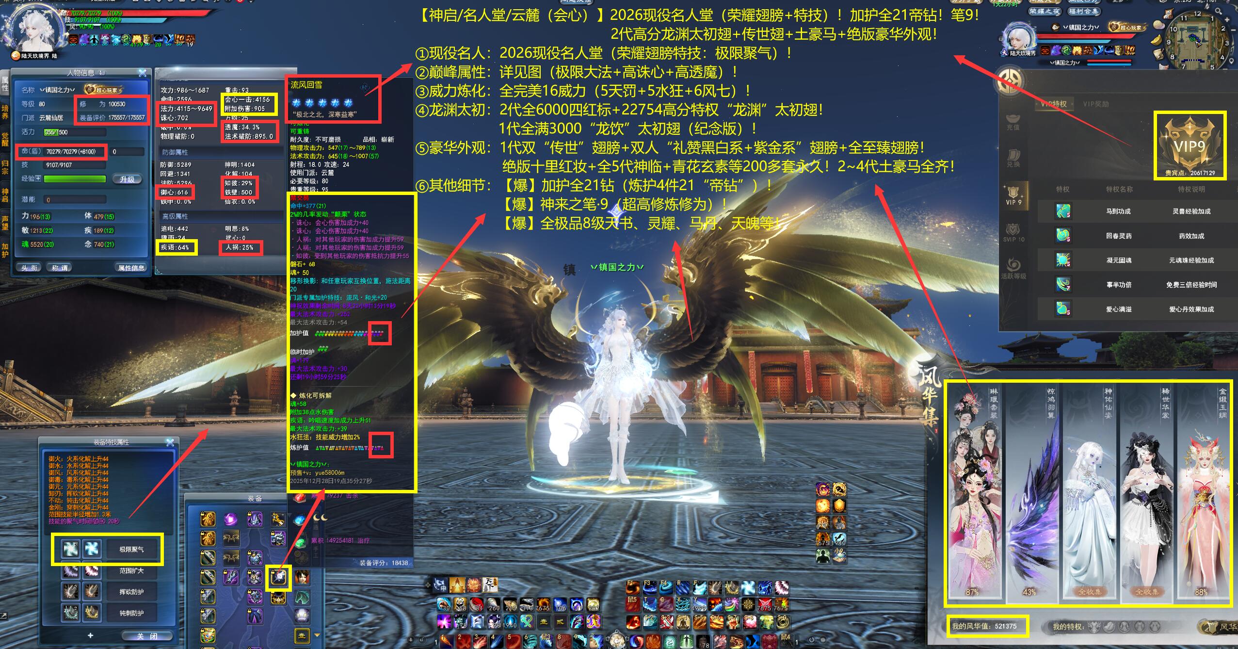 亮点: ①现役名人:2026现役名人堂第1会心云麓(荣耀翅膀特技:极限聚气)! ②巅峰属性:详见图(极限大法+高诛心+高透魔)! ③威力炼化:全完美16威力(5天罚+5水狂+6风七)! ④龙渊太初:2代全6000四红标+22754高分特权“龙渊”太初翅!1代全满3000“龙饮”太初翅(纪念版)! ⑤豪华外观:1代双“传世”翅膀+双人“礼赞·白+黑”翅膀+1~16代至臻翅膀!绝版十里红妆+全5代神临+青花玄素等200多套永久!2~4代土豪马全齐!