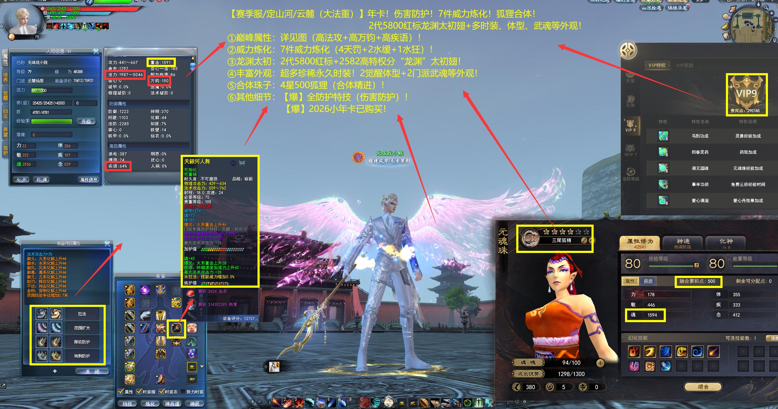 【赛季服/定山河/云麓(大法重)】年卡!伤害防护!7件威力炼化!狐狸合体!2代5800红标龙渊太初翅+多时装、体型、武魂等外观——无味戏小贱