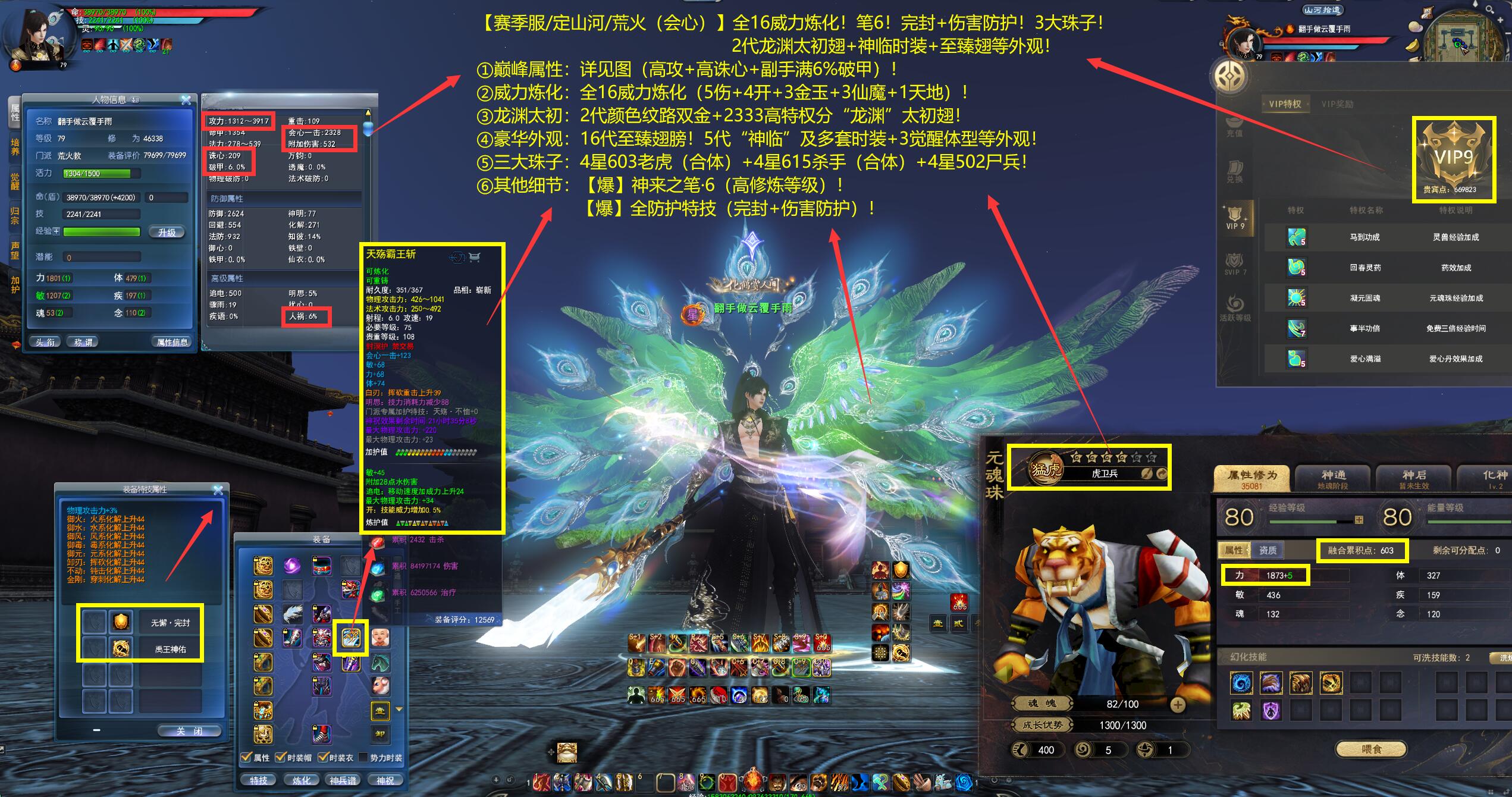 亮点: ①巅峰属性:详见图(高攻+高诛心+副手满6%破甲)! ②威力炼化:全16威力炼化(5伤+4开+3金玉+3仙魔+1天地)! ③龙渊太初:2代颜色纹路双金+2333高特权分“龙渊”太初翅! ④豪华外观:16代至臻翅膀!5代“神临”及多套时装+3觉醒体型等外观! ⑤三大珠子:4星603老虎(合体)+4星615杀手(合体)+4星502尸兵! ⑥其他细节:【爆】神来之笔·6(高修炼等级)!【爆】全防护特技(完封+伤害防护)!