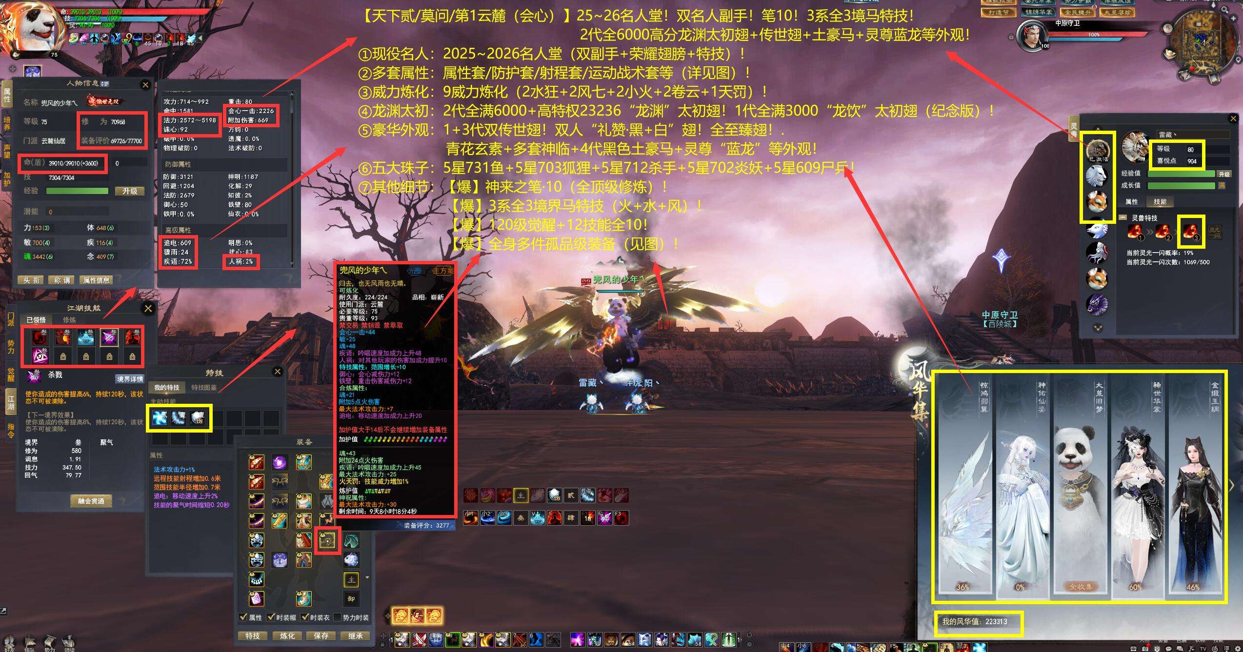 亮点: ①现役名人:2025~2026名人堂(双副手+荣耀翅膀+特技)! ②多套属性:属性套/防护套/射程套/运动战术套等(详见图)! ③威力炼化:9威力炼化(2水狂+2风七+2小火+2卷云+1天罚)! ④龙渊太初:2代全满6000+高特权23236“龙渊”太初翅!1代全满3000“龙饮”太初翅(纪念版)! ⑤豪华外观:1+3代双传世翅!双人“礼赞·黑+白”翅!全至臻翅!青花玄素+多套神临+4代黑色土豪马+灵尊“蓝龙”等外观!