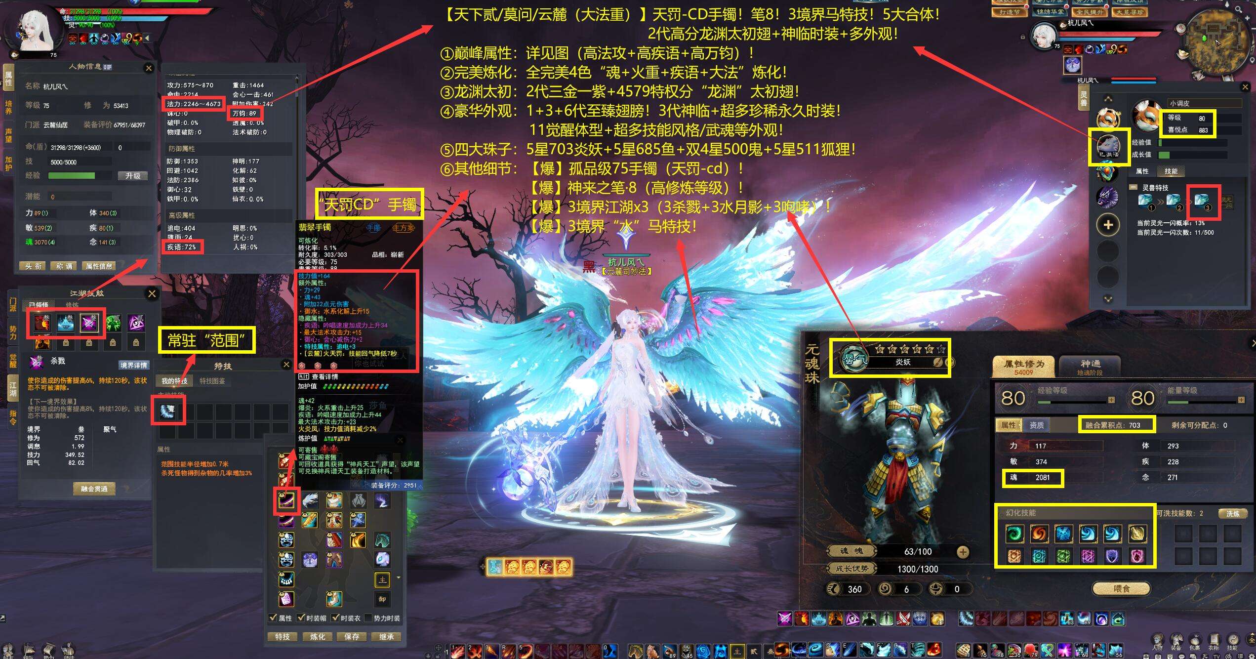 亮点: ①巅峰属性:详见图(高法攻+高疾语+高万钧)! ②完美炼化:全完美4色“魂+火重+疾语+大法”炼化! ③龙渊太初:2代三金一紫+4579特权分“龙渊”太初翅! ④豪华外观:1+3+6代至臻翅膀!3代神临+超多珍稀永久时装!11觉醒体型+超多技能风格/武魂等外观! ⑤四大珠子:5星703炎妖+5星685鱼+双4星500鬼+5星511狐狸! ⑥其他细节:【爆】孤品级75手镯(天罚-cd)!【爆】神来之笔·8(高修炼等级)!【爆】3境界江湖x3(3杀戮+3水月影+3咆哮)!【爆】3境界“水”马特技!