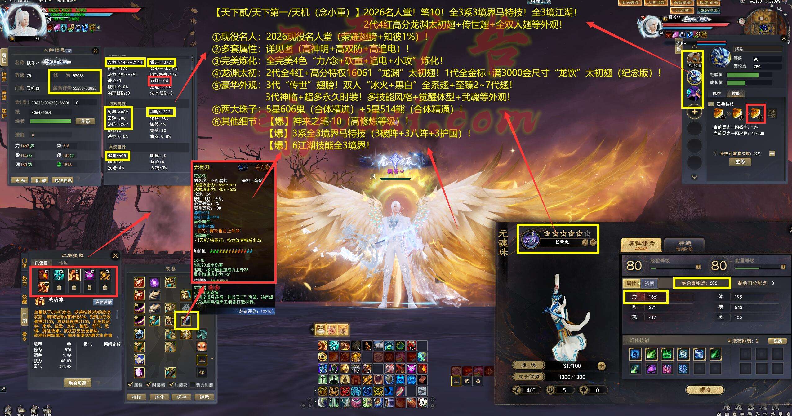 【天下贰/天下第一/天机(念小重)】2026名人堂!笔10!全3系3境界马特技!全3境江湖!2代4红高分龙渊太初翅+传世翅+全双人翅等外观——枫爷丷
