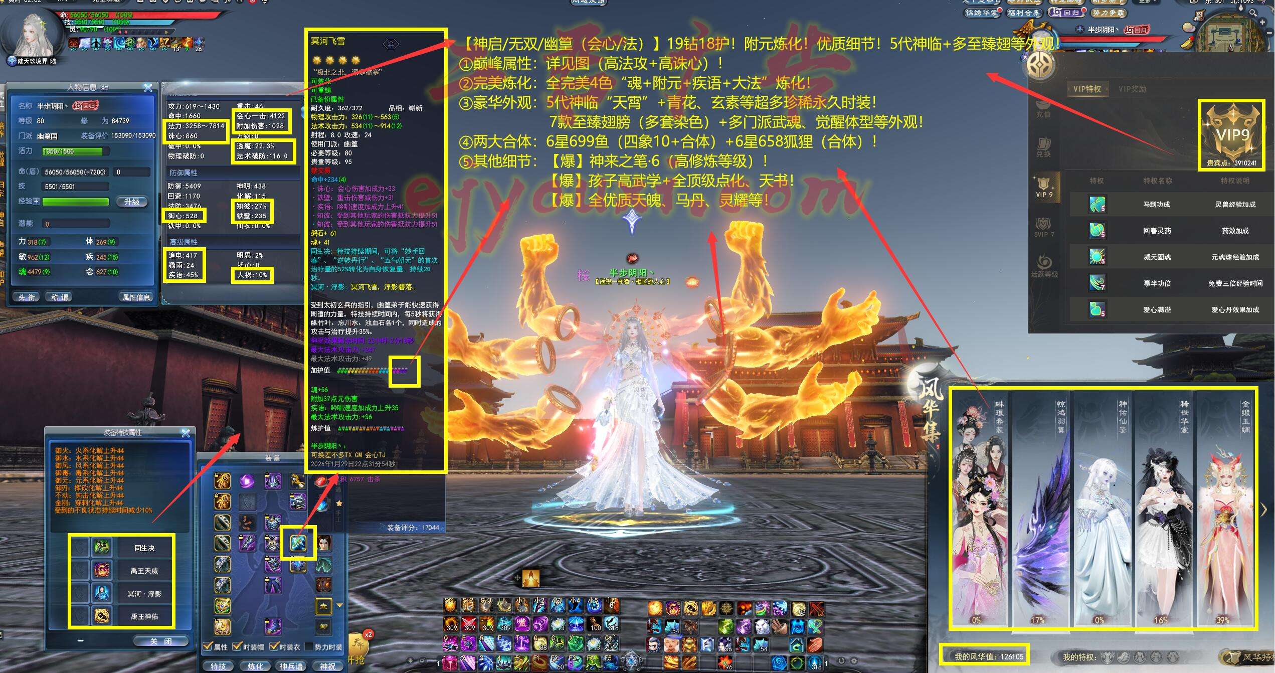 亮点: ①巅峰属性:详见图(高法攻+高诛心)! ②完美炼化:全完美4色“魂+附元+疾语+大法”炼化! ③豪华外观:5代神临“天霄”+青花、玄素等超多珍稀永久时装!7款至臻翅膀(多套染色)+多门派武魂、觉醒体型等外观! ④两大合体:6星699鱼(四象10+合体)+6星658狐狸(合体)! ⑤其他细节:【爆】神来之笔·6(高修炼等级)!【爆】孩子高武学+全顶级点化、天书!【爆】全优质天魄、马丹、灵耀等!