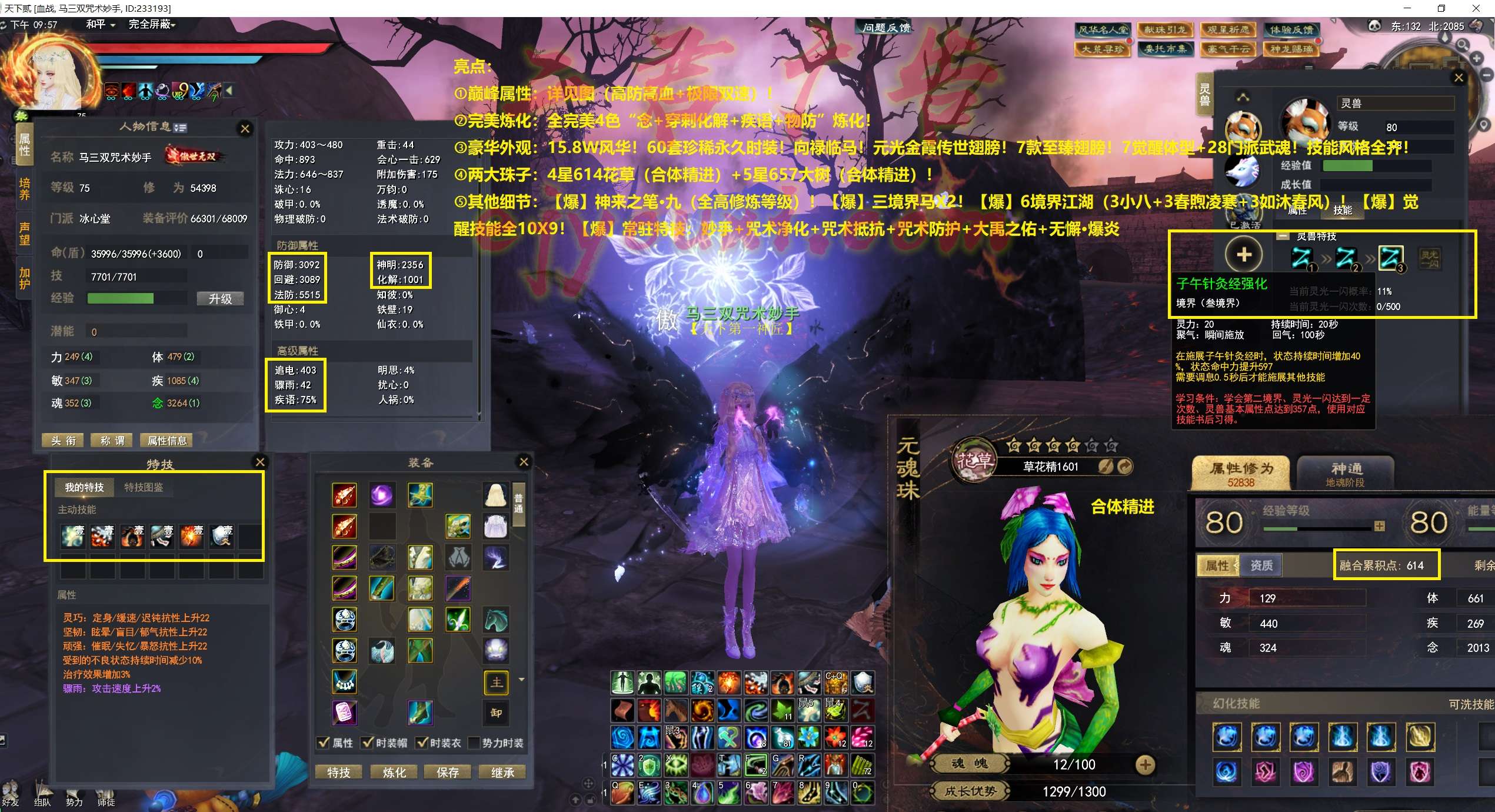 亮点: ①巅峰属性:详见图(高防高血+极限双速)! ②完美炼化:全完美4色“念+穿刺化解+疾语+物防”炼化! ③豪华外观:15.8W风华!60套珍稀永久时装!向禄临马!元光金霞传世翅膀!7款至臻翅膀!7觉醒体型+28门派武魂!技能风格全齐!  ④两大珠子:4星614花草(合体精进)+5星657大树(合体精进)!