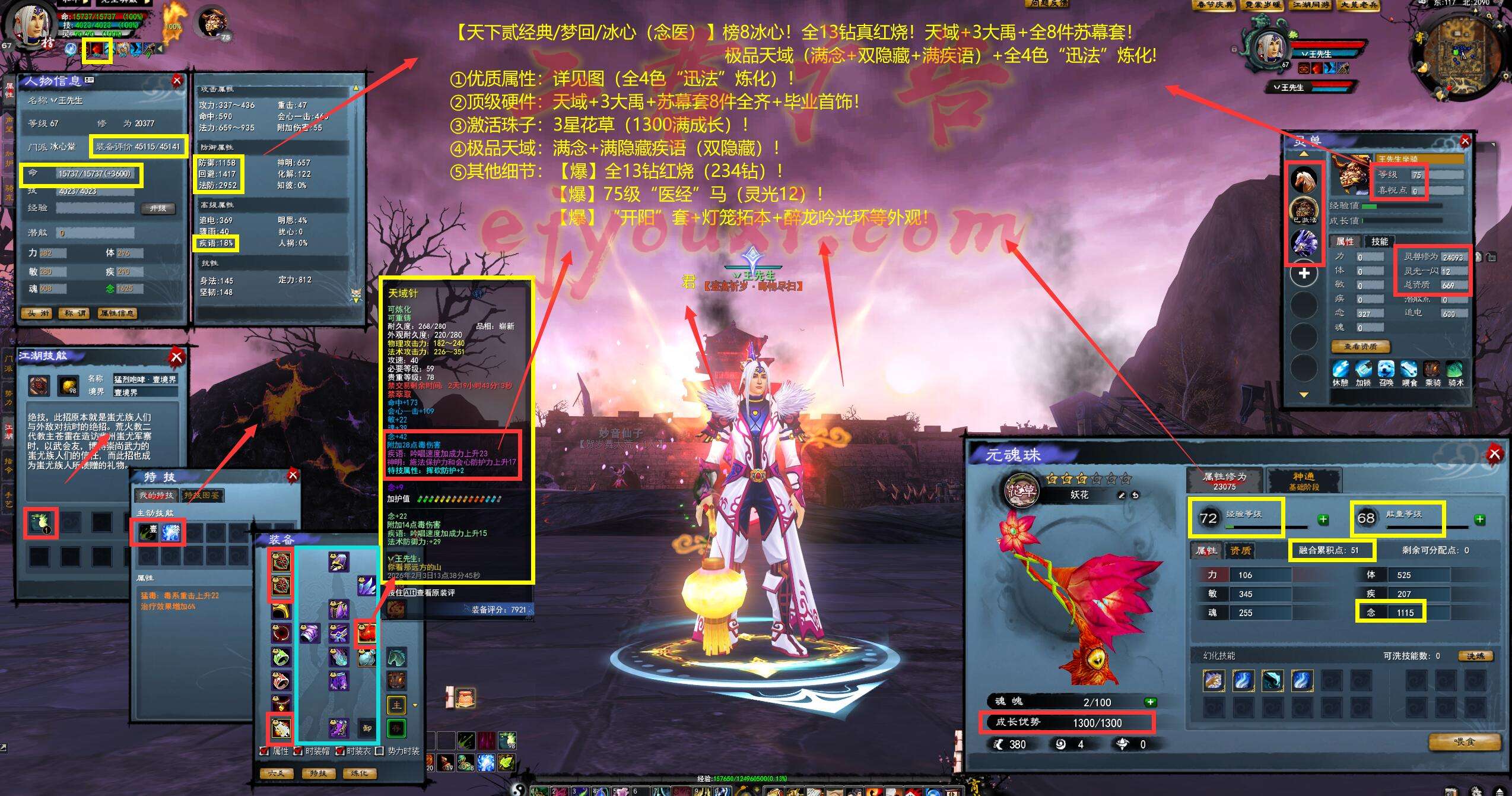 亮点: ①优质属性:详见图(全4色“迅法”炼化)! ②顶级硬件:天域+3大禹+苏幕套8件全齐+毕业首饰! ③激活珠子:3星花草(1300满成长)! ④极品天域:满念+满隐藏疾语(双隐藏)! ⑤其他细节:【爆】全13钻红烧(234钻)!【爆】75级“医经”马(灵光12)!【爆】“开阳”套+灯笼拓本+醉龙吟光环等外观!