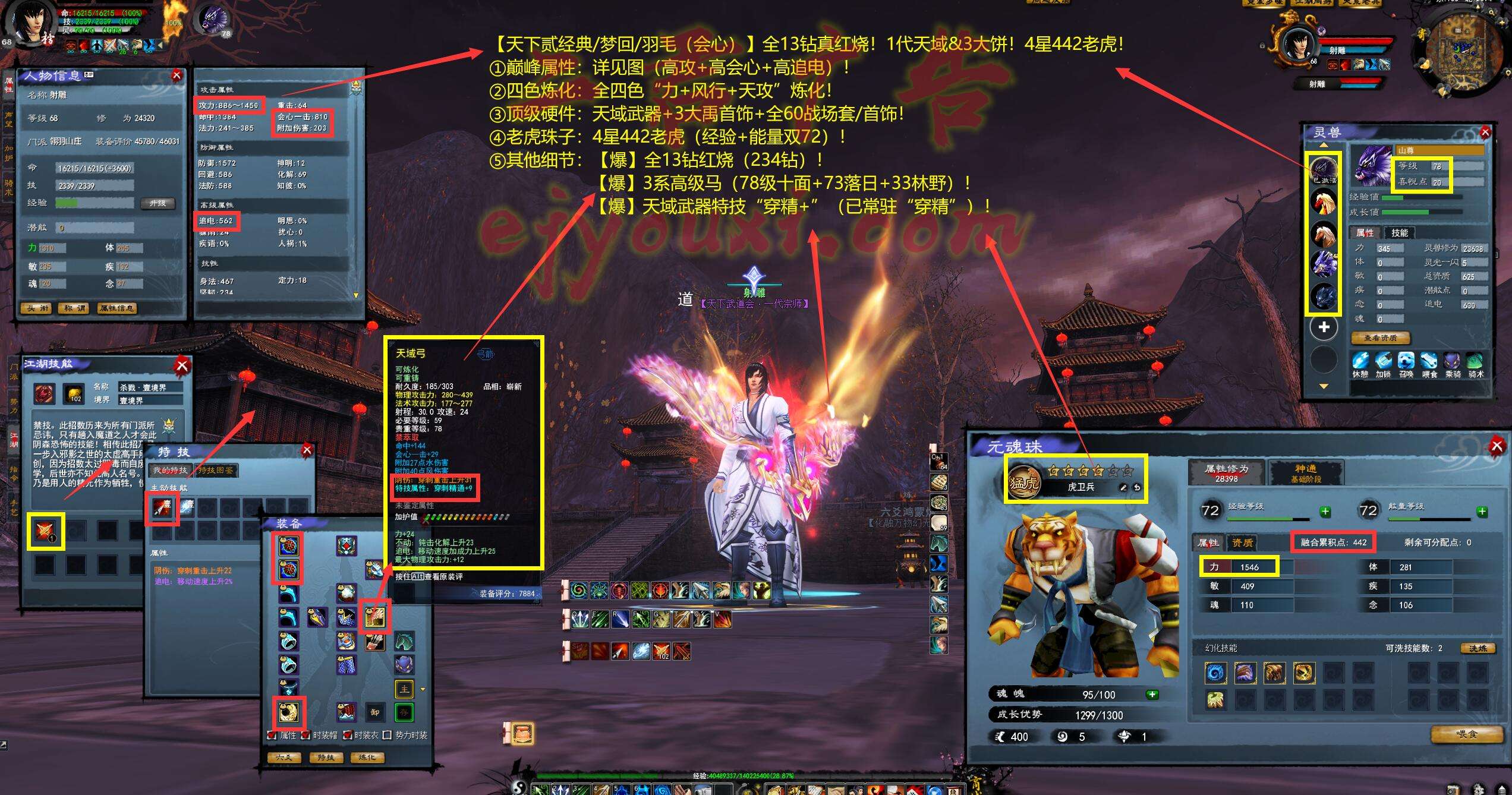 亮点: ①巅峰属性:详见图(高攻+高会心+高追电)! ②四色炼化:全四色“力+风行+天攻”炼化! ③顶级硬件:天域武器+3大禹首饰+全60战场套/首饰! ④老虎珠子:4星442老虎(经验+能量双72)! ⑤其他细节:【爆】全13钻红烧(234钻)!【爆】3系高级马(78级十面+73落日+33林野)!【爆】天域武器特技“穿精+”(已常驻“穿精”)!