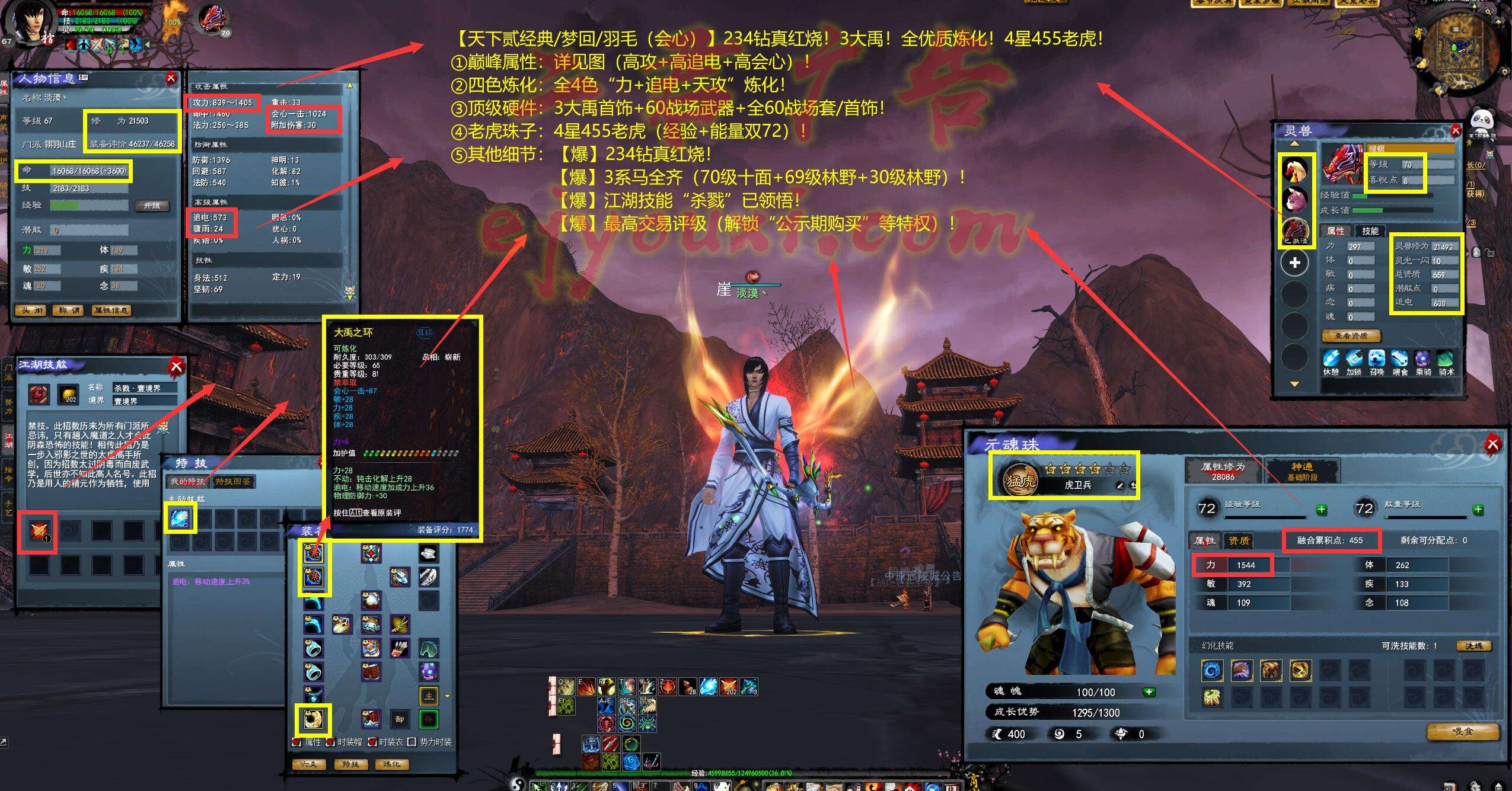 亮点: ①巅峰属性:详见图(高攻+高追电+高会心)! ②四色炼化:全4色“力+追电+天攻”炼化! ③顶级硬件:3大禹首饰+60战场武器+全60战场套/首饰! ④老虎珠子:4星455老虎(经验+能量双72)! ⑤其他细节:【爆】234钻真红烧!【爆】3系马全齐(70级十面+69级林野+30级林野)!【爆】江湖技能“杀戮”已领悟!【爆】最高交易评级(解锁“公示期购买”等特权)!