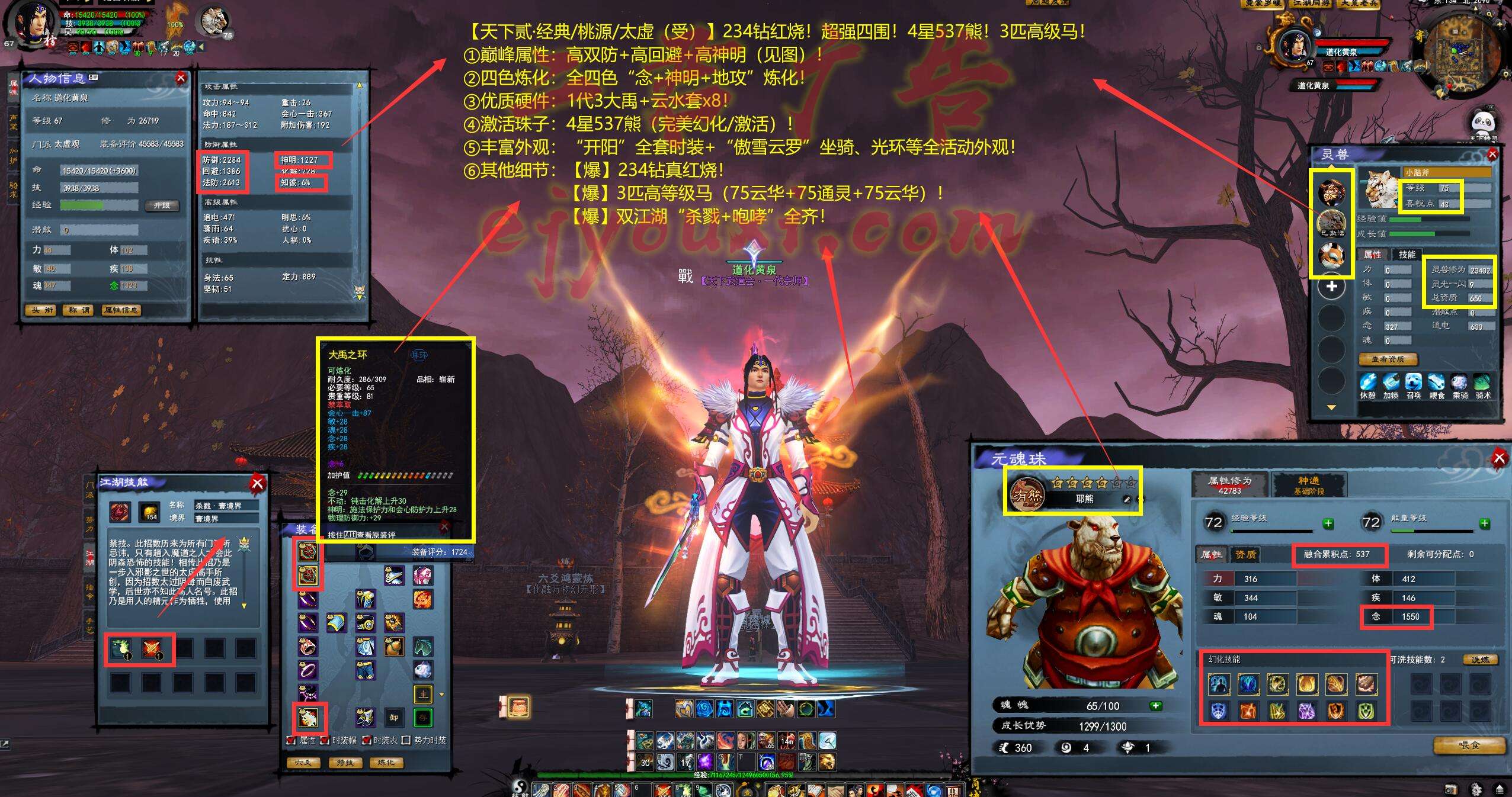 亮点: ①巅峰属性:高双防+高回避+高神明(见图)! ②四色炼化:全四色“念+神明+地攻”炼化! ③优质硬件:1代3大禹+云水套x8! ④激活珠子:4星537熊(完美幻化/激活)! ⑤丰富外观:“开阳”全套时装+“傲雪云罗”坐骑、光环等全活动外观! ⑥其他细节:【爆】234钻真红烧!【爆】3匹高等级马(75云华+75通灵+75云华)!【爆】双江湖“杀戮+咆哮”全齐!