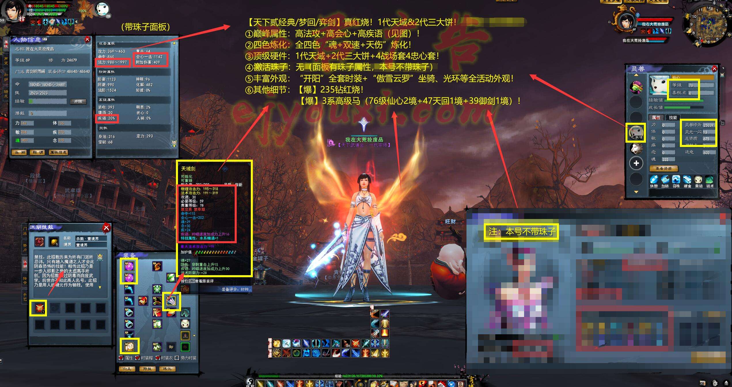 亮点: ①巅峰属性:高法攻+高会心+高疾语(见图)! ②四色炼化:全四色“魂+双速+天伤”炼化! ③顶级硬件:1代天域+2代三大饼+4战场套4忠心套! ④激活珠子:无 ⑤丰富外观:“开阳”全套时装+“傲雪云罗”坐骑、光环等全活动外观! ⑥其他细节:【爆】235钻红烧!【爆】3系高级马(76级仙心2境+47天回1境+39御剑1境)