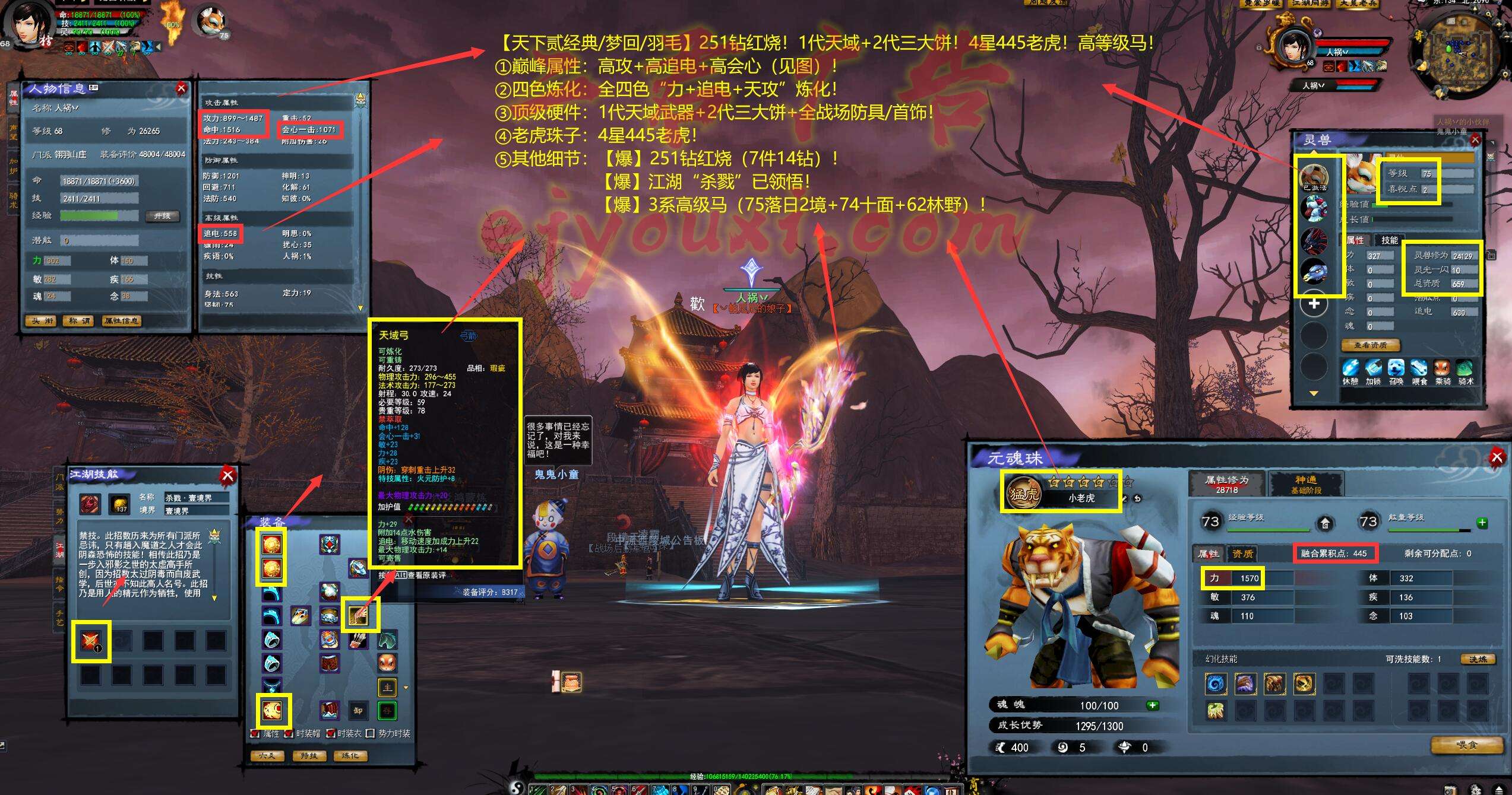 亮点: ①巅峰属性:高攻+高追电+高会心(见图)! ②四色炼化:全四色“力+追电+天攻”炼化! ③顶级硬件:1代天域武器+2代三大饼+全战场防具/首饰! ④老虎珠子:4星445老虎! ⑤其他细节:【爆】251钻红烧(17件14钻)!【爆】江湖“杀戮”已领悟!【爆】3系高级马(75落日2境+74十面+62林野)!