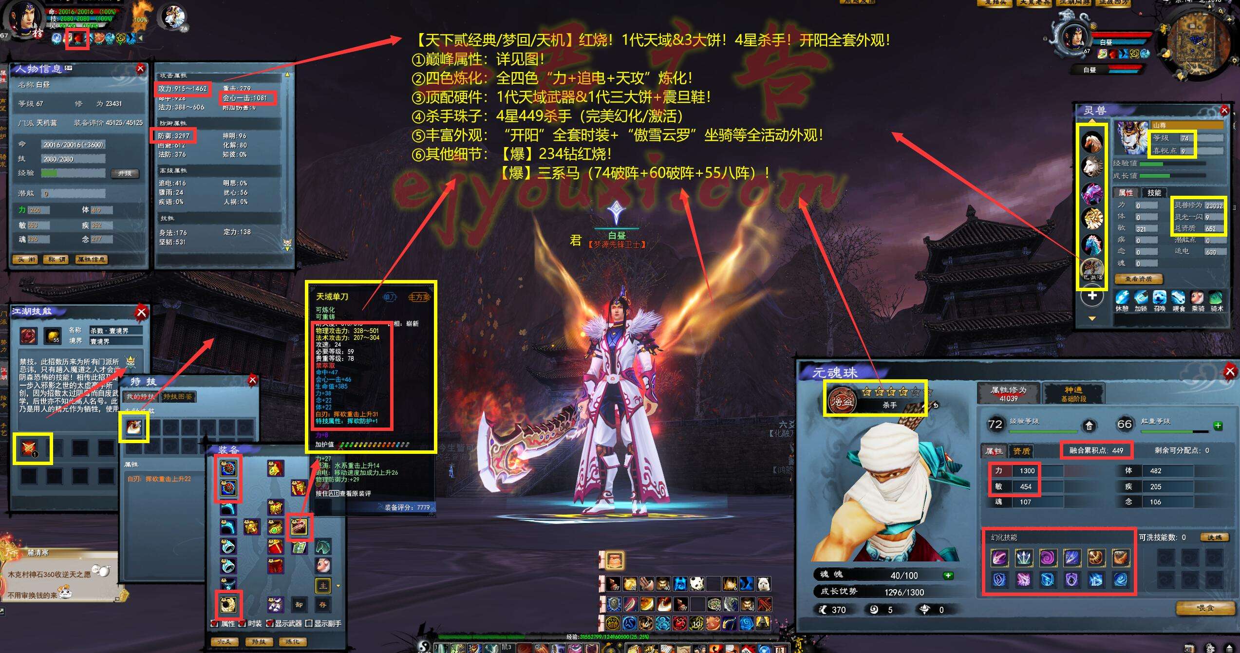 亮点: ①巅峰属性:详见图! ②四色炼化:全四色“力+追电+天攻”炼化! ③顶配硬件:1代天域武器&1代三大饼+震旦鞋! ④杀手珠子:4星449杀手(完美幻化/激活) ⑤丰富外观:“开阳”全套时装+“傲雪云罗”坐骑等全活动外观! ⑥其他细节:【爆】234钻红烧!【爆】三系马(74破阵+60破阵+55八阵)!