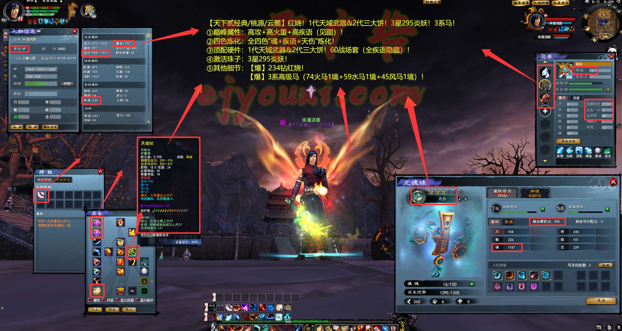 亮点: ①巅峰属性:高攻+高火重+高疾语(见图)! ②四色炼化:全四色“魂+疾语+天伤”炼化! ③顶配硬件:1代天域武器&2代三大饼!60战场套(全疾语隐藏)! ④激活珠子:3星295炎妖! ⑤其他细节:【爆】234钻红烧!【爆】3系高级马(74火马1境+59水马1境+45风马1境)!