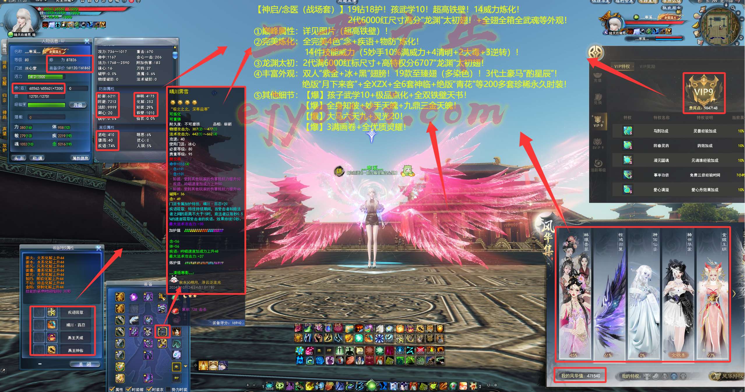 亮点: ①巅峰属性:详见图片(超高铁壁)! ②完美炼化:全完美4色“念+疾语+物防”炼化!12件技能威力(5妙手10%满威力+4清明+2大毒+1逆转)! ③龙渊太初:2代满6000红标尺寸+高特权分6707“龙渊”太初翅! ④丰富外观:双人“紫金+冰+黑”翅膀!19款至臻翅(多染色)!3代土豪马“酌星辰”!绝版“月下来客”+全XZX+全6套神临+绝版“青花”等200多套珍稀永久时装!